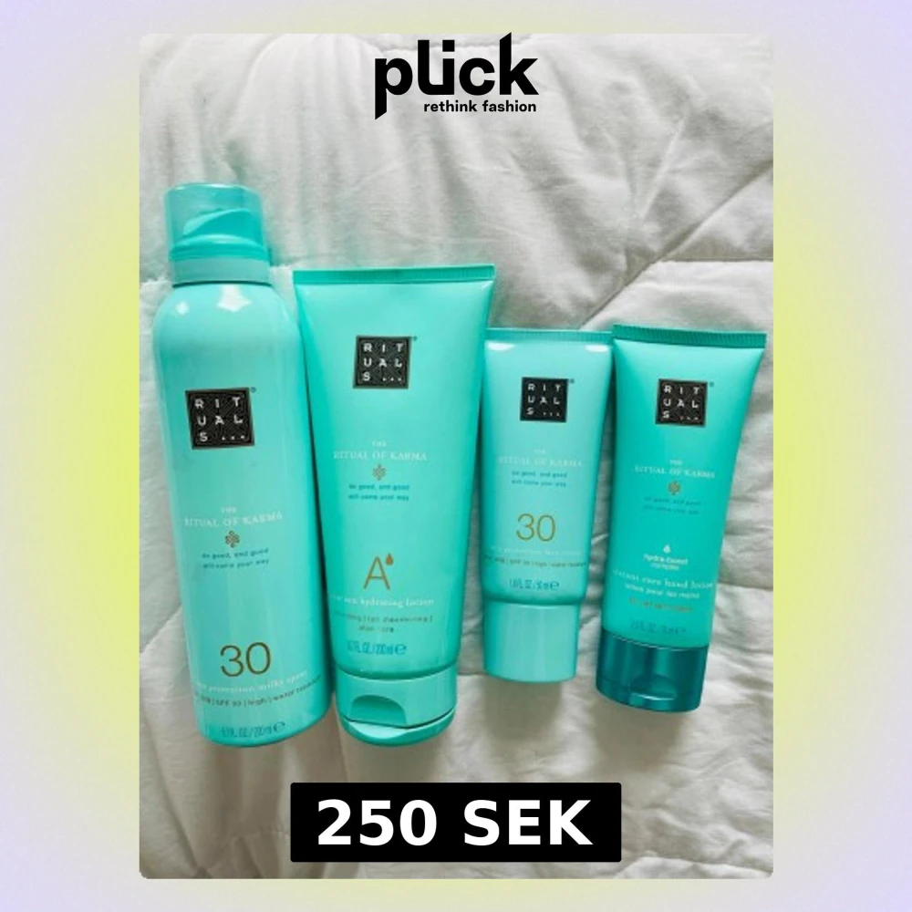 Fyra produkter från Rituals The Ritual of Karma-serien: solskyddsspray SPF 30, återfuktande after sun lotion med aloe vera, solskyddskräm för ansiktet SPF 30 och handkräm med hydra-boost complex. Alla i snygga turkosa förpackningar, perfekt för dig som gillar fräsch hudvård.