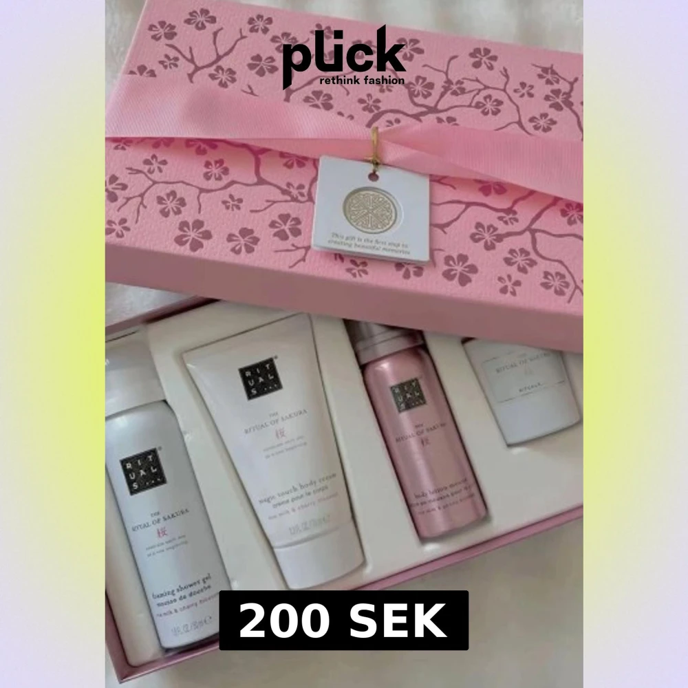 Lyxig presentbox från Rituals med serien The Ritual of Sakura. Innehåller duschgel, body cream, body lotion mousse och ett doftljus. Produkterna har en fräsch doft av ris och körsbärsblom. Kommer i en söt rosa ask med blommönster och rosett.