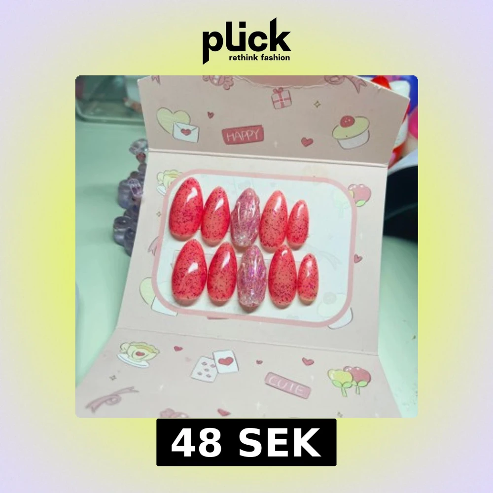 Säljer ett set med 10 st press-on naglar i en snygg rosa färg med rosa glittereffekt. Två av naglarna har en transparent bas med iriserande flakes som ger extra bling. Naglarna är mandelformade och har en glansig finish, perfekta för att ge dina händer en poppig look.