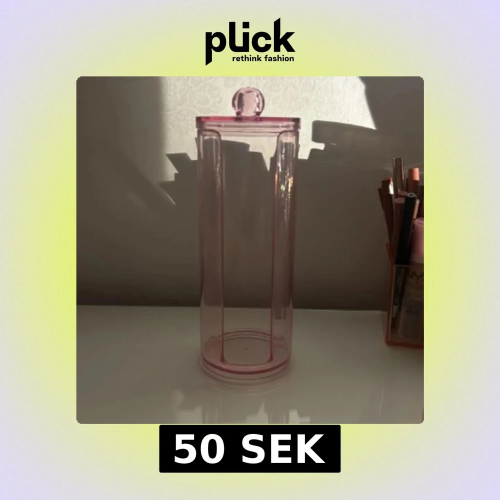 Säljer en stilren och praktisk rosa transparent behållare med ett runt lock. Perfekt för förvaring av småsaker eller sminkborstar. Den har en enkel och elegant design som passar in i de flesta rum.
