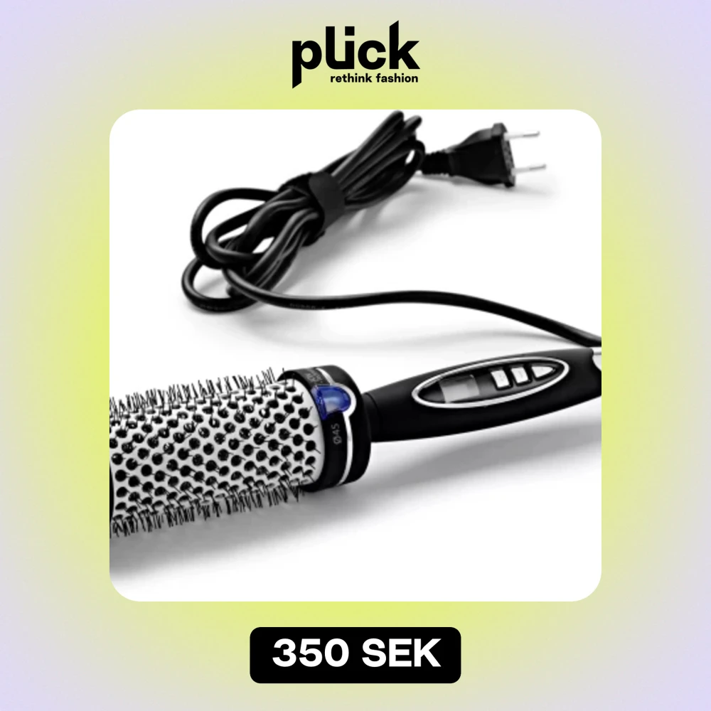 Säljer en elektrisk rundborste med digital display och justerbara temperaturinställningar. Perfekt för att skapa volym och lockar i håret. Borsten har en svart och silver design med en lång sladd för enkel användning. Köp direkt eller ge prisförslag!