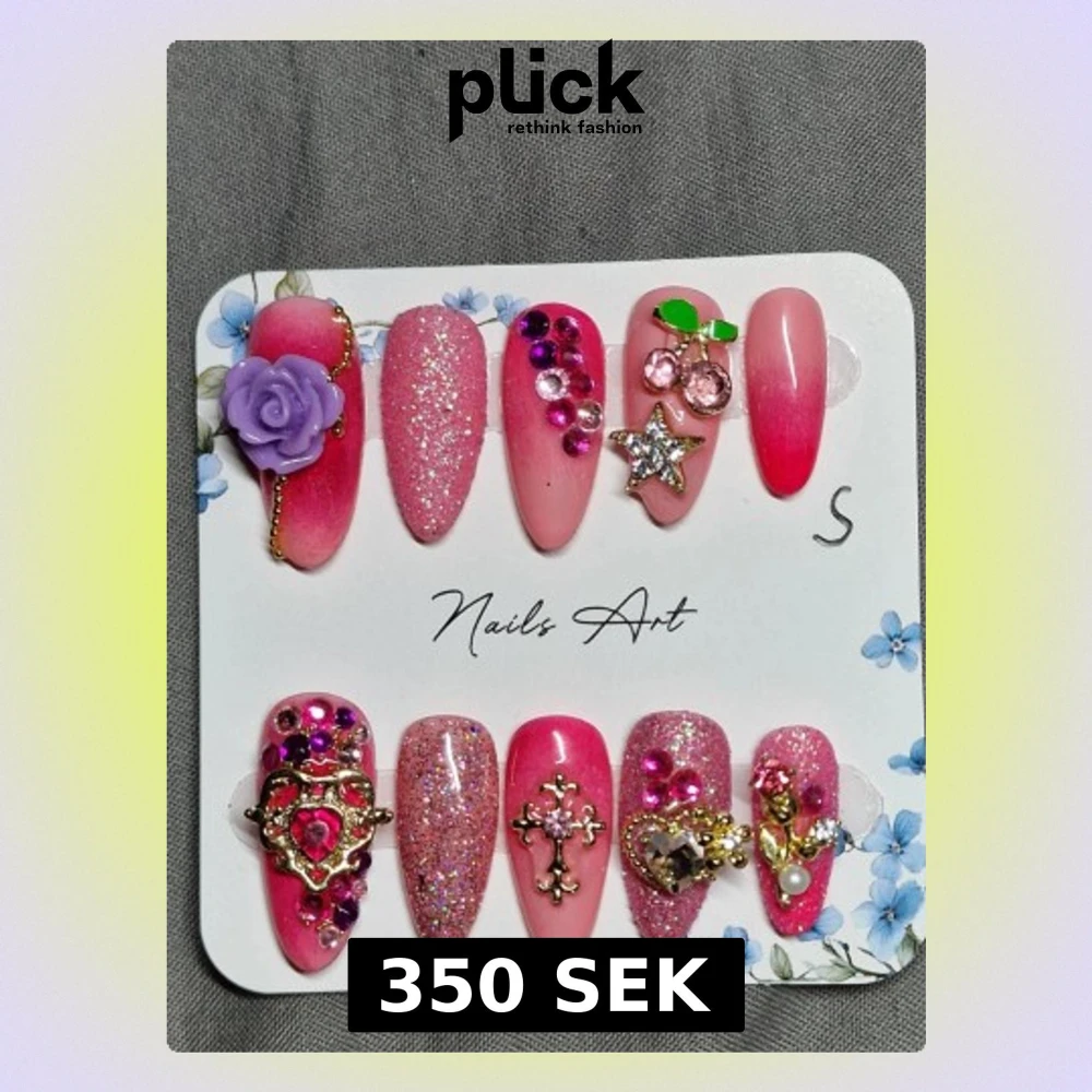 Handgjorda nagel set bra kvalitet och fina. Man får med rengöring beskrivning o de man behöver för att applicera naglarna❤️ storlek s