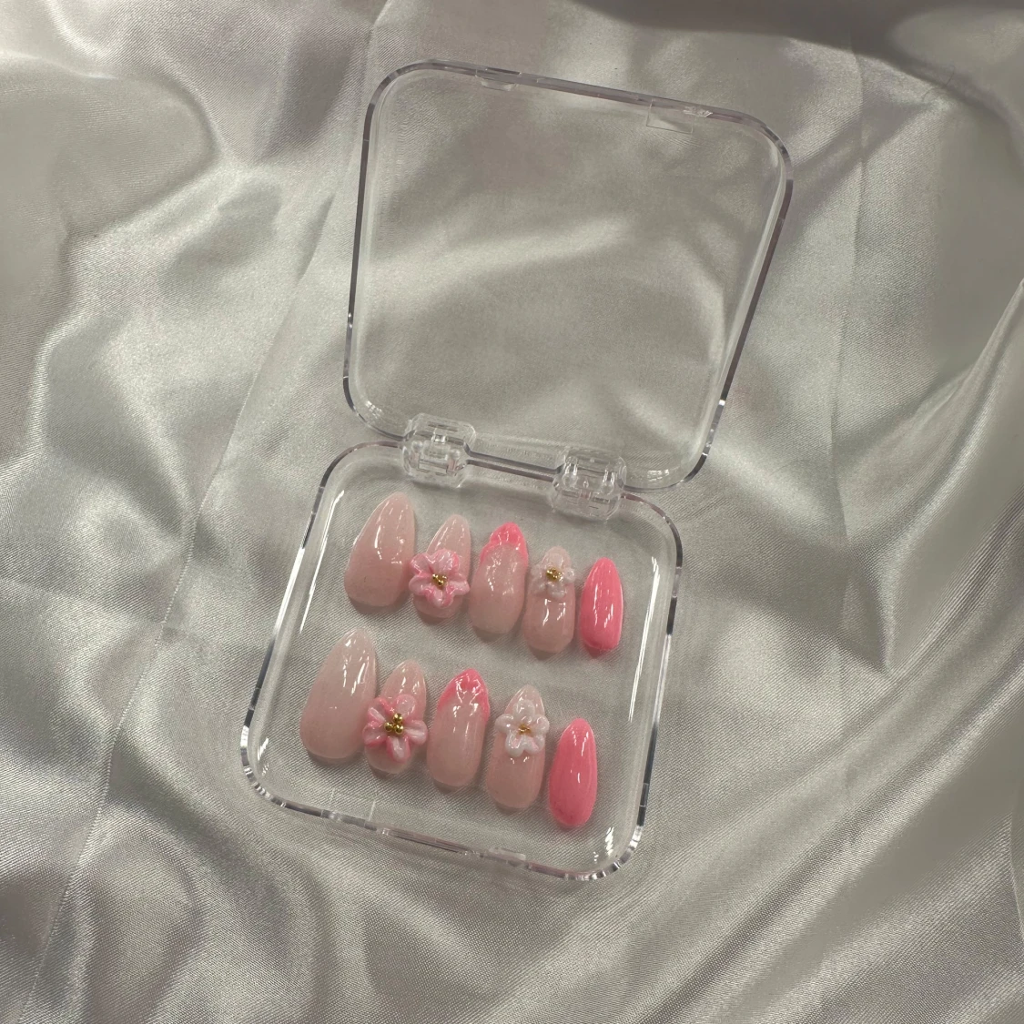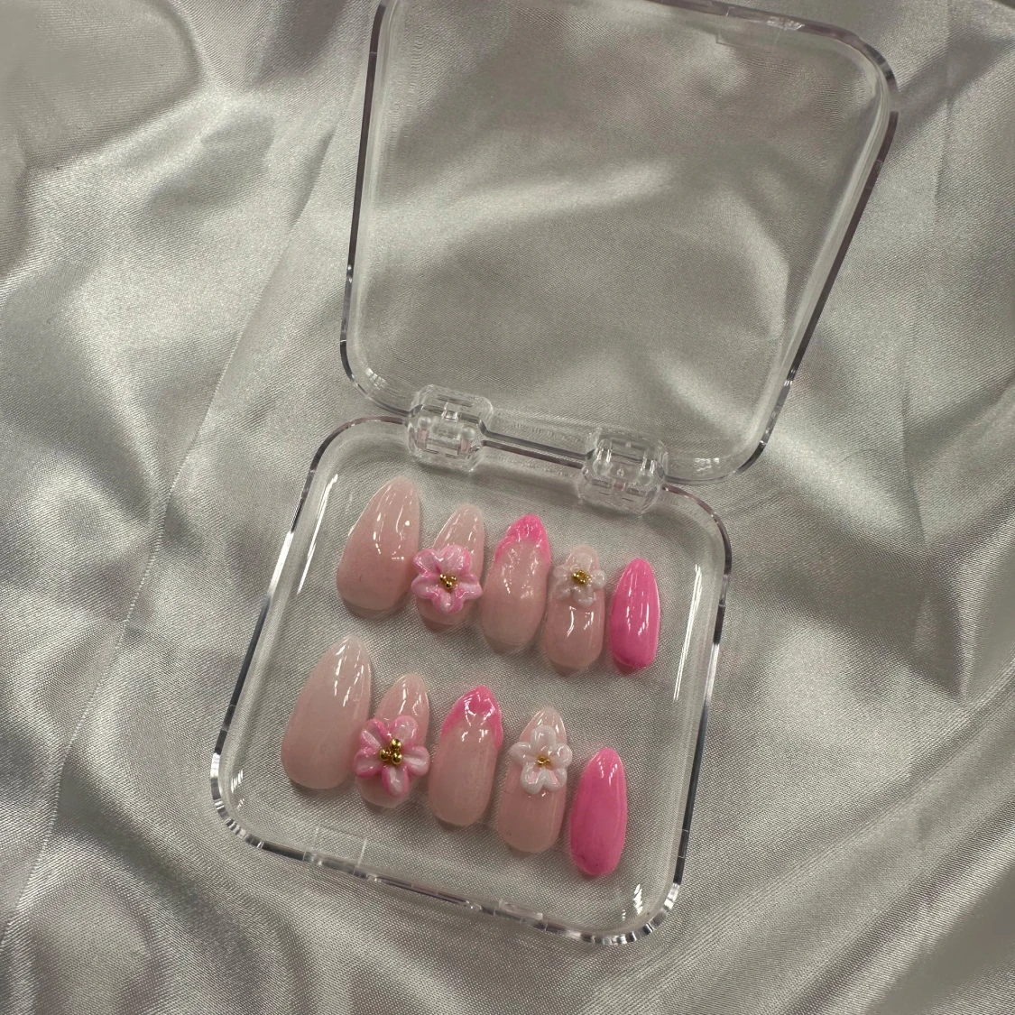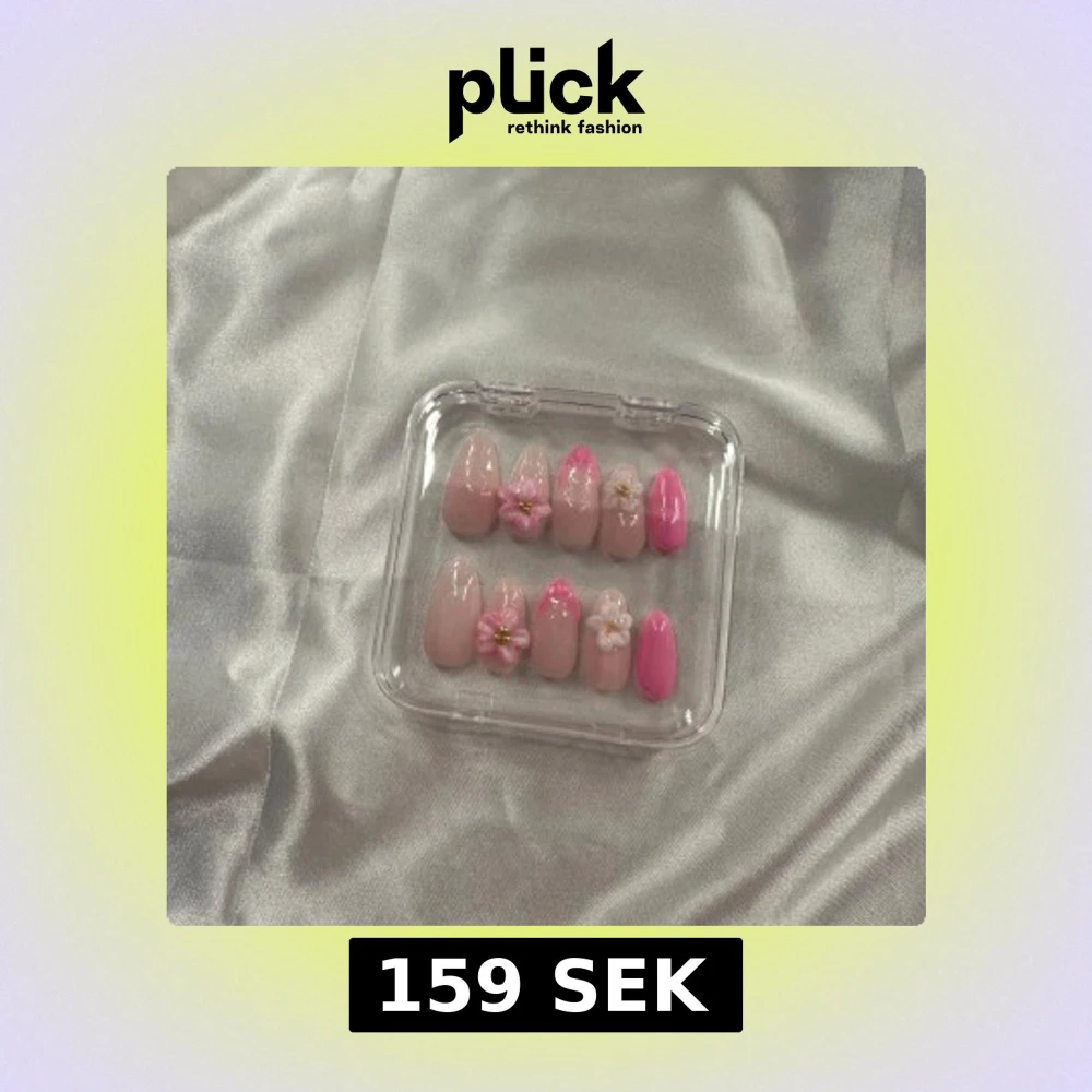 Säljer ett set pres ons i mandelform med nude och rosa färger. Några naglar har handgjorda 3D-blommor i vitt och rosa med små pärldetaljer. Perfekt för dig som vill ha en söt och trendig look.