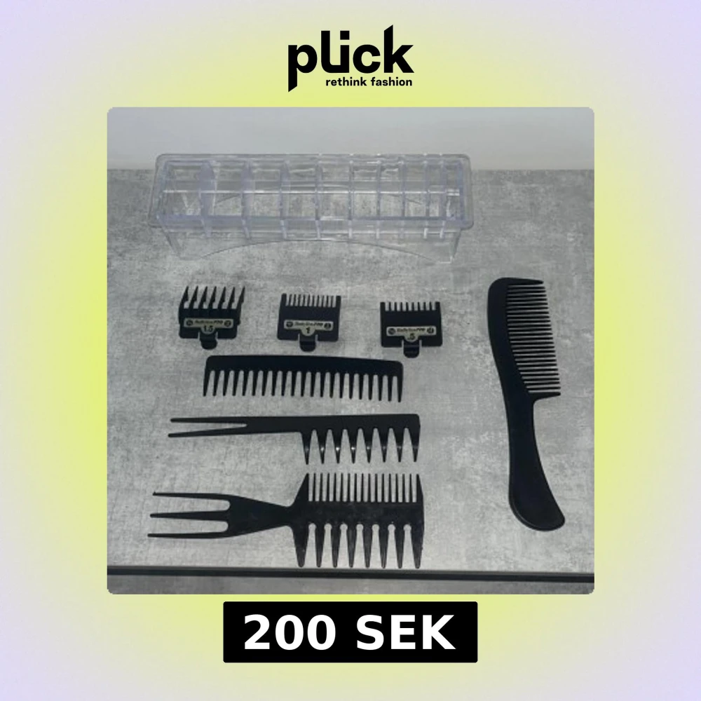 Komplett set med BabylissPRO klippkammar (storlekar 1, 1.5, 5), stylingkammar och transparent förvaringslåda. Perfekt för professionell hårklippning och styling. Alla delar är i gott skick utan synligt slitage eller defekter.