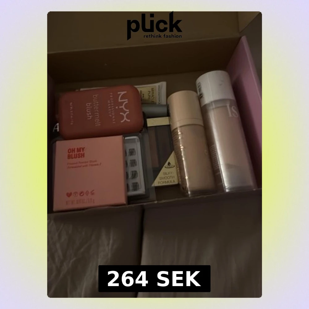 Säljer ett sminkpaket med NYX buttermelt blush i persikorosa, Oh My Blush puderrouge, foundation i beige nyans, primer, lösögonfransar och face mist. Flera produkter i snygga förpackningar, perfekt för dig som vill testa nytt smink.