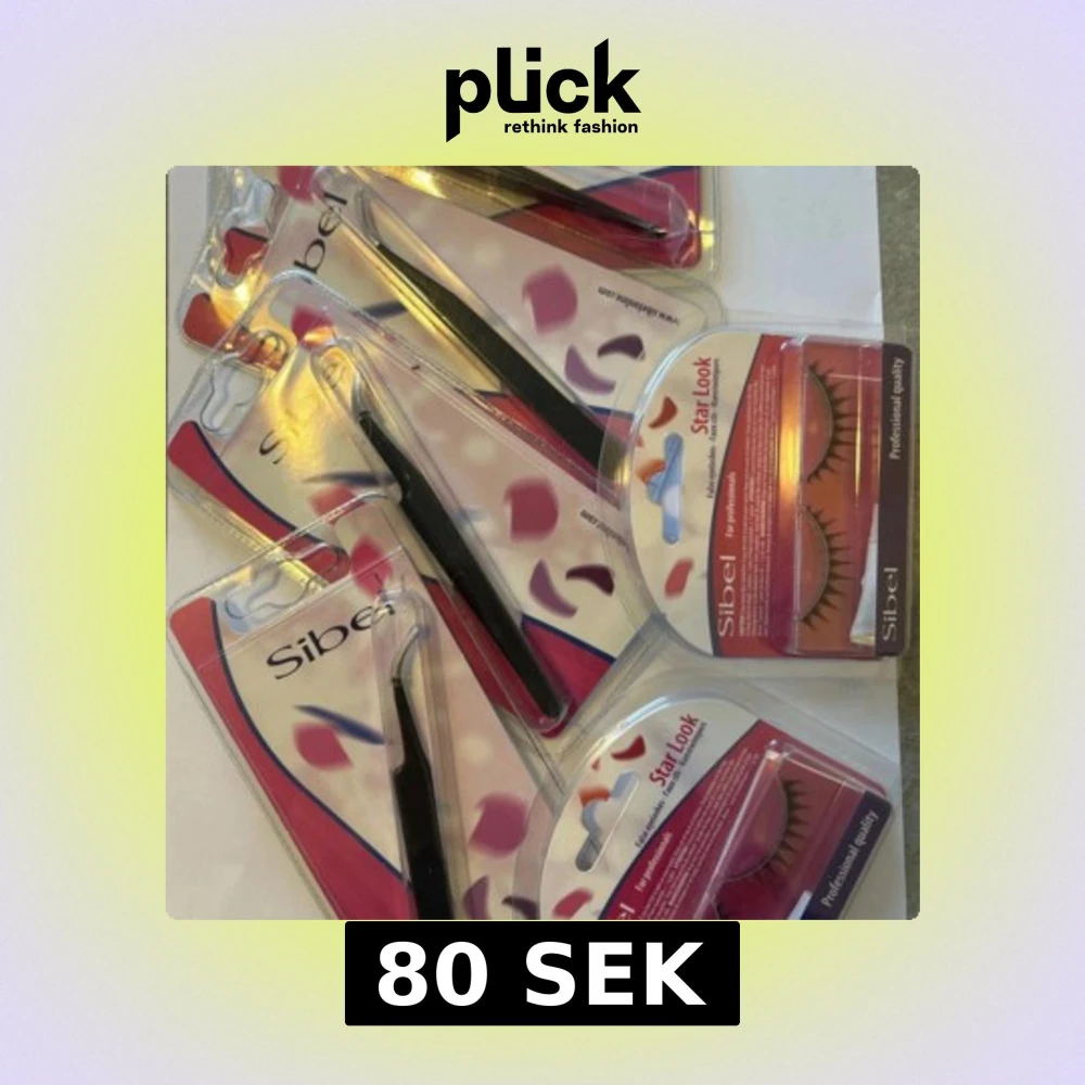 Flera förpackningar med Sibel Star Look lösögonfransar och svarta pincetter. Fransarna är långa och böjda för en dramatisk look. Pincetterna är smala och svarta, perfekta för applicering av fransar.