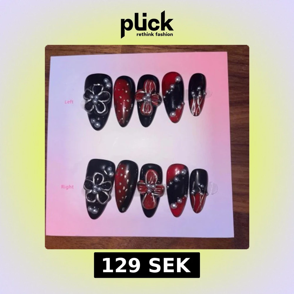 Snygga lösnaglar i svart och rött med silverdetaljer, 3D-blommor och pärlor. Naglarna har almond form och cool design med prickar, linjer och blommor. Perfekt för dig som vill sticka ut med unika naglar.