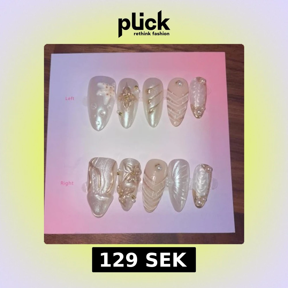 Snygga press-on naglar i pärlemorvitt och nude med guldiga detaljer, pärlor och 3D-mönster. Mix av spetsiga och fyrkantiga former, dekorerade med stjärndetaljer och skimrande effekter. Perfekt för dig som vill ha unika och trendiga naglar utan salongsbesök.