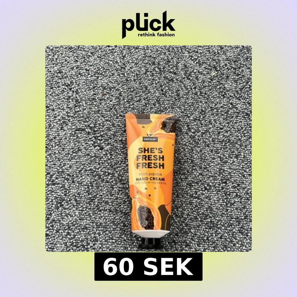 Handkräm från Sence med fräsch papayadoft, 75 ml. Tuben har färgglad design i orange och svart med papayaillustration. Innehåller 95% naturliga ingredienser och är vegansk. Perfekt att ha i väskan för mjuka händer hela dagen.