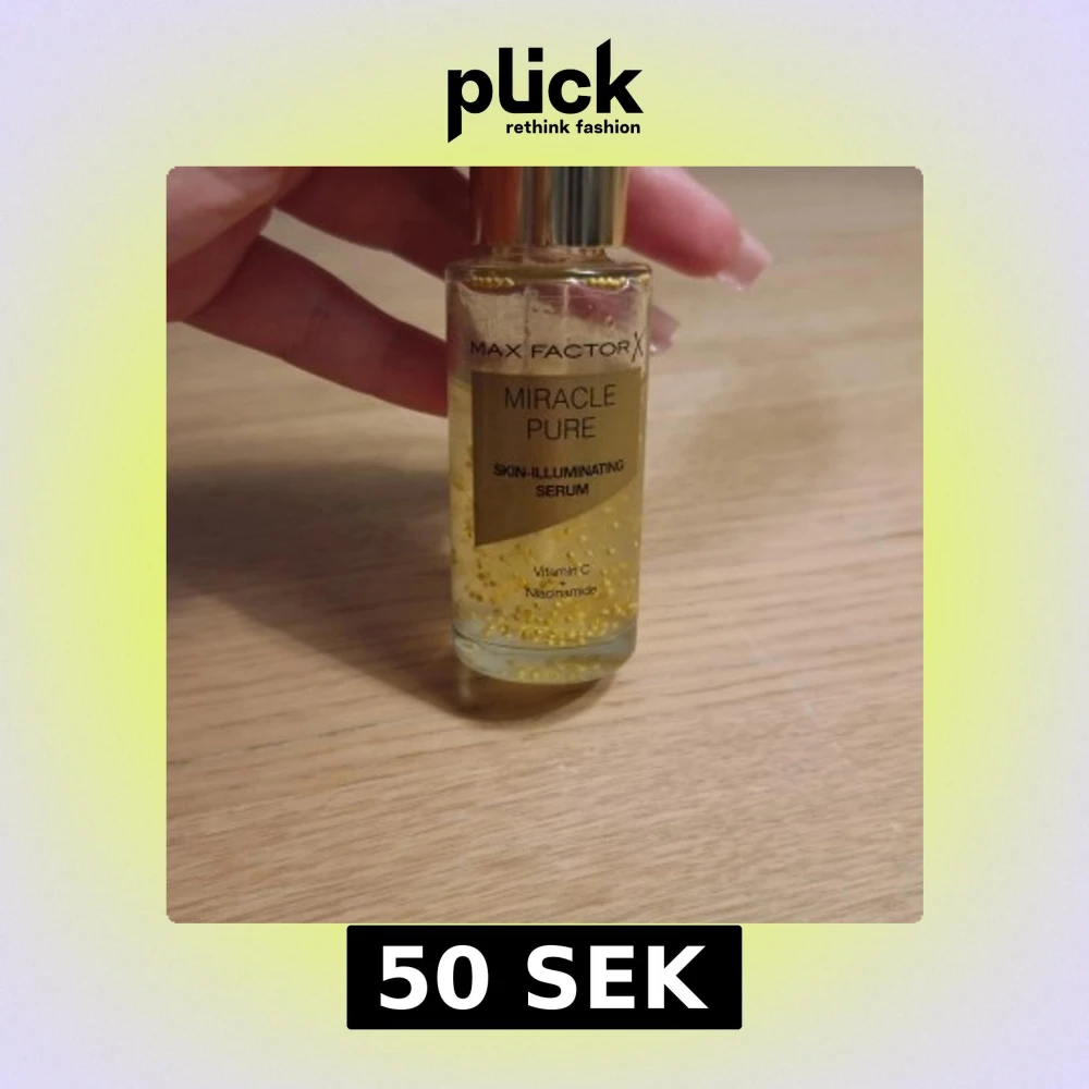Max Factor Miracle Pure Skin-Illuminating Serum med Vitamin C och Niacinamide. Genomskinlig gel med guldiga pärlor i glasflaska med guldig pump. Perfekt som primer för glow och återfuktning innan smink. Köpt hela vägen i Polen och den fungerade som magi men det vart för mycket kosmetika så den kan gå till någon annan som har nytta av den.