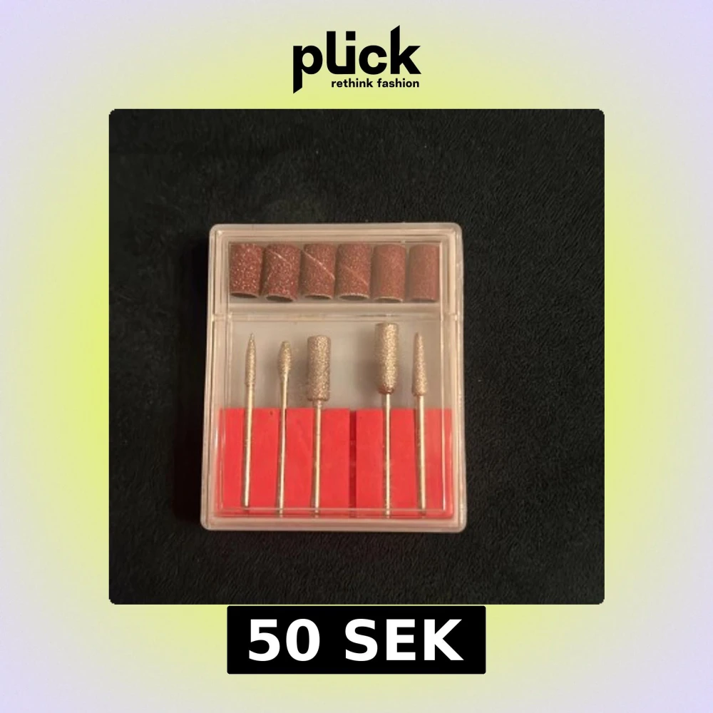 Ett oanvänt kit med fem olika metallsliphuvuden och sex bruna slipband för elfil, perfekt för nagelvård och formning. Kommer i en genomskinlig plastask.