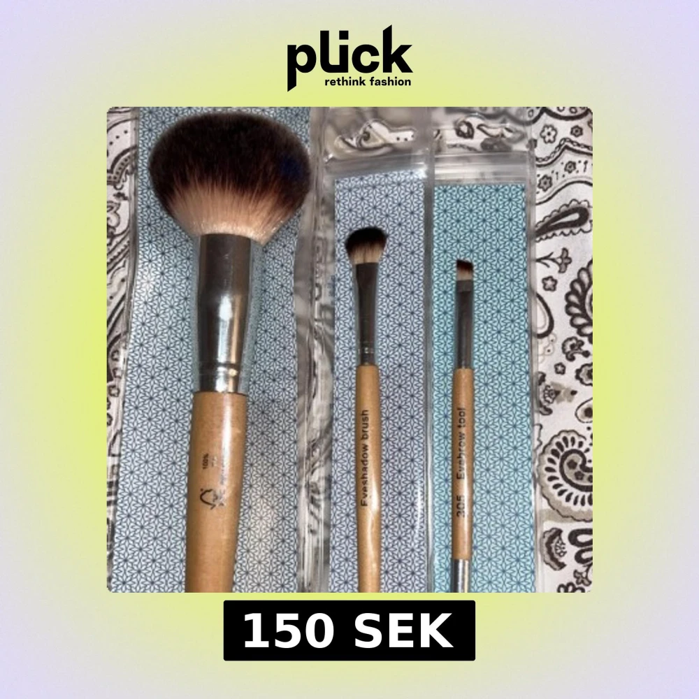 Säljer ett set med helt nya, tre sminkborstar: en stor fluffig borste för ansiktet, en ögonskuggsborste och ett verktyg för ögonbryn. Alla har trähandtag och metallfästen, med mjuka syntetiska borst i beige och brunt. Perfekt för att fixa både bas och detaljer.