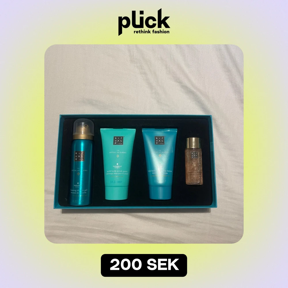 Säljer ett lyxigt presentset från Rituals med fyra produkter i en snygg turkos förpackning. Setet innehåller en duschskum, kroppskräm, kroppsskrubb och en liten flaska med olja. Perfekt för en avkopplande hemmaspa-upplevelse. Förpackningen har ett vackert blommönster och texten 'Happiness can be found in the smallest things'. Pris kan diskuteras 🥰
