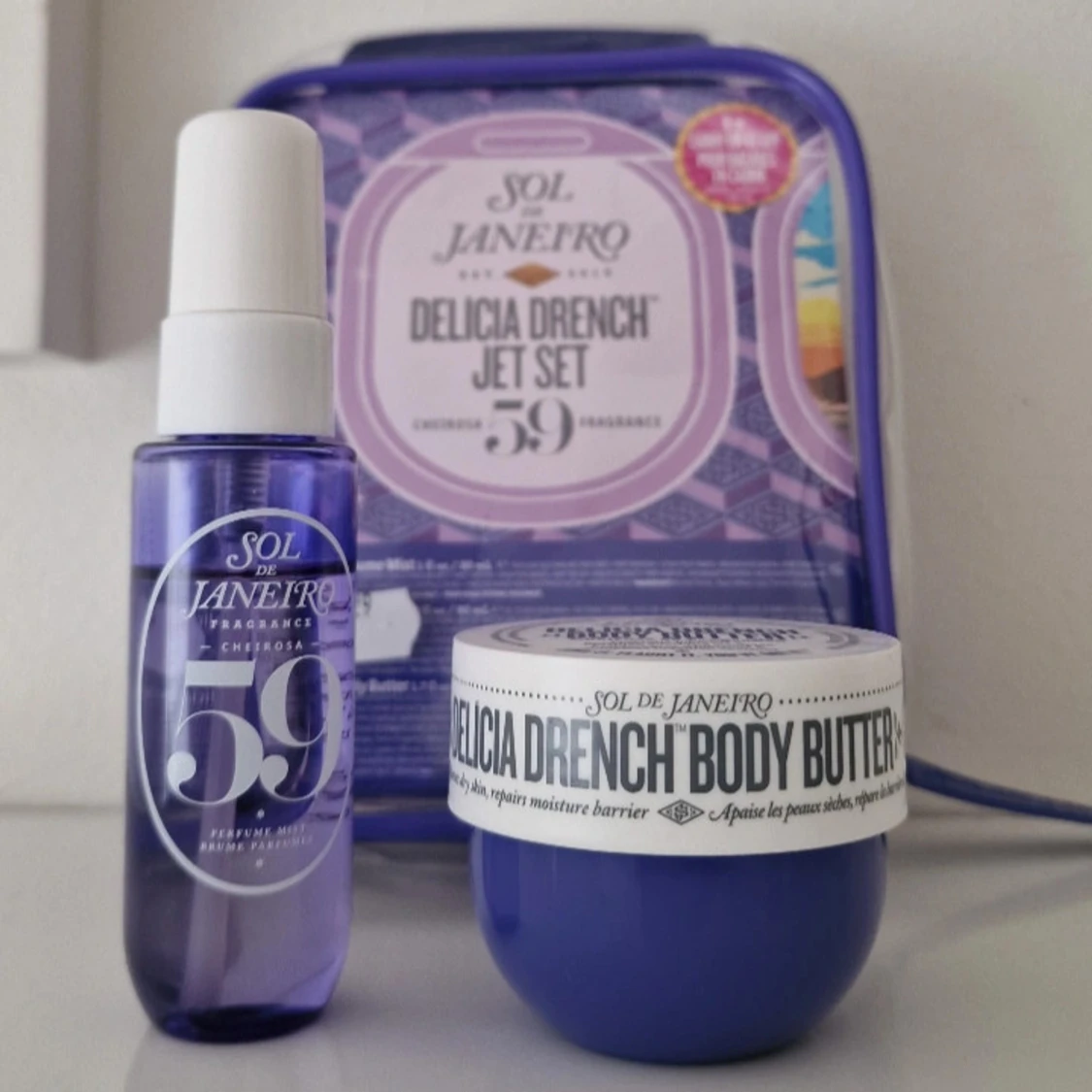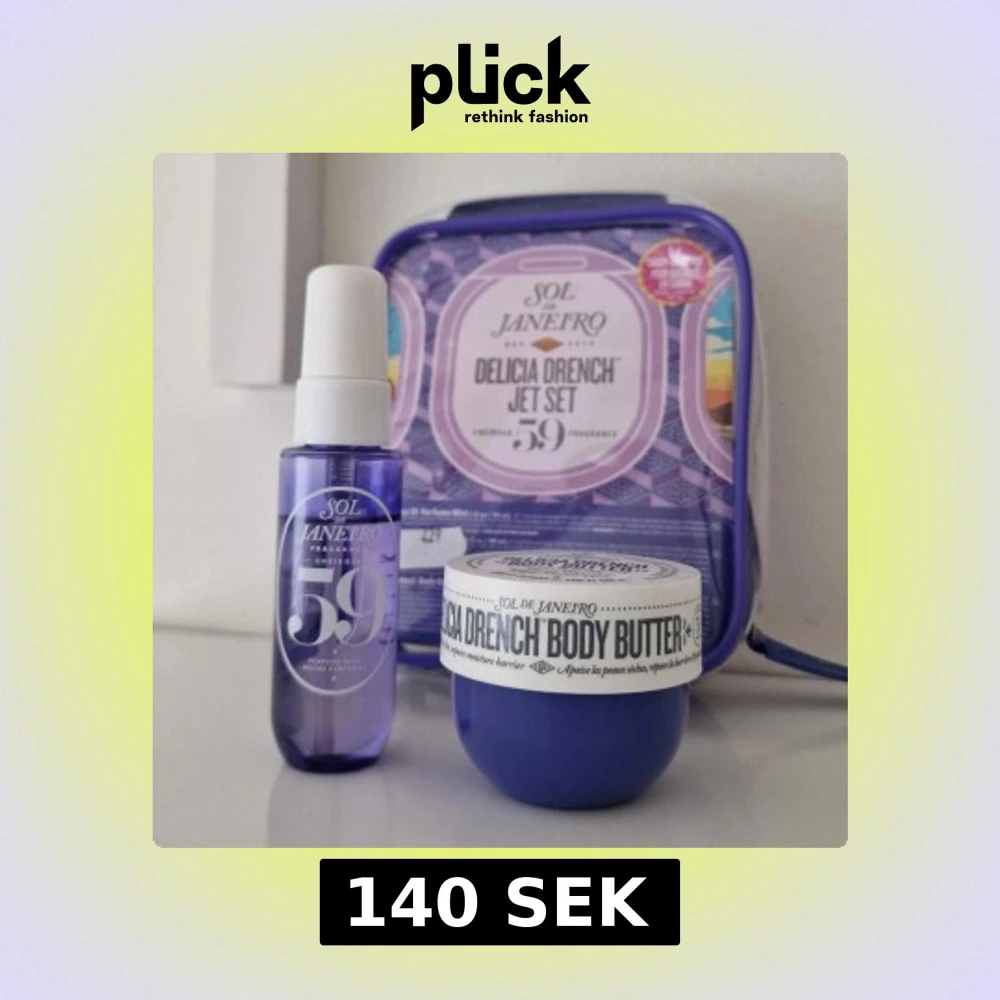 OBS Kolla samma annons med fri frakt bland mina annonser. Sol de Janeiro Delicia Drench Jet Set innehåller en lila face mist Cheirosa 59 och en body butter i matchande lila burk. Setet har en fräsch doft och kommer i en snygg lila förpackning, perfekt för dig som gillar att dofta gott och återfukta huden. Mist är använd få gånger. Butter är ny. Köparen får allt som är på bild.