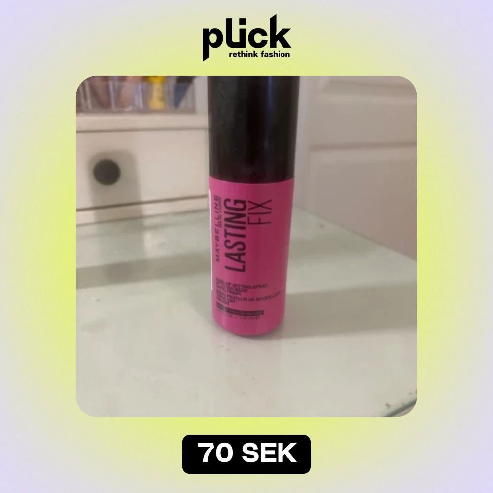 Säljer en Maybelline Lasting Fix Face Mist som hjälper till att hålla sminket på plats hela dagen. Den kommer i en snygg rosa flaska med svart lock. Perfekt för att fräscha upp looken och ge en matt finish. Använd den som sista steget i din sminkrutin för bästa resultat!
