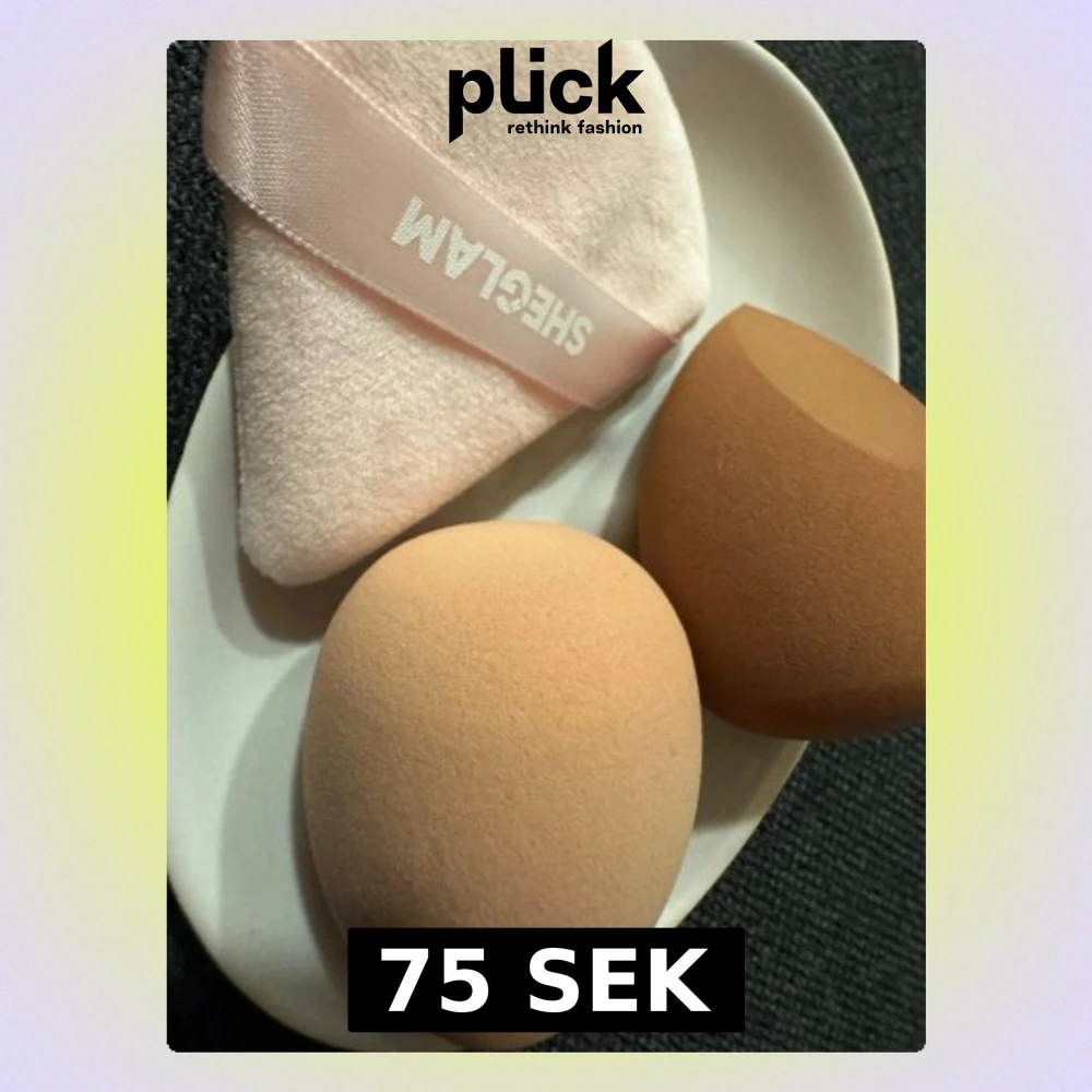 Säljer två mjuka makeupsvampar i beige och brun samt en trekantig puderpuff i ljusrosa med SHEGLAM-logga. Perfekta för att applicera foundation, concealer eller puder. Puffen har ett praktiskt band för grepp och svamparna har rundad och snedskuren form för enkel applicering.