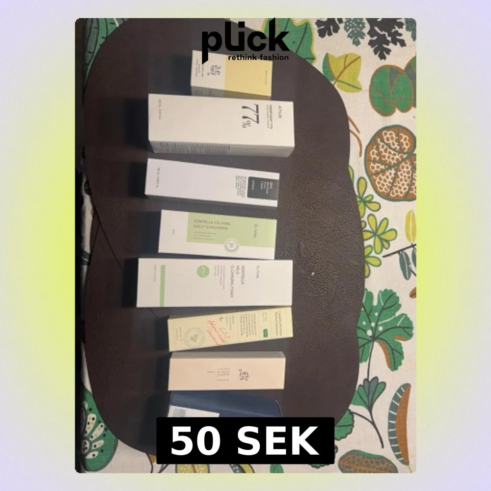 Säljer ett kit med koreanska sminkprodukter i originalkartong. Innehåller bland annat toner, solskydd, rengöringsskum och essence från märken som iUNIK, Anua, COSRX och Axis-Y. Förpackningarna är i ljusa färger som vitt, grönt, beige och blått. Perfekt för dig som gillar K-beauty. 50kr/st