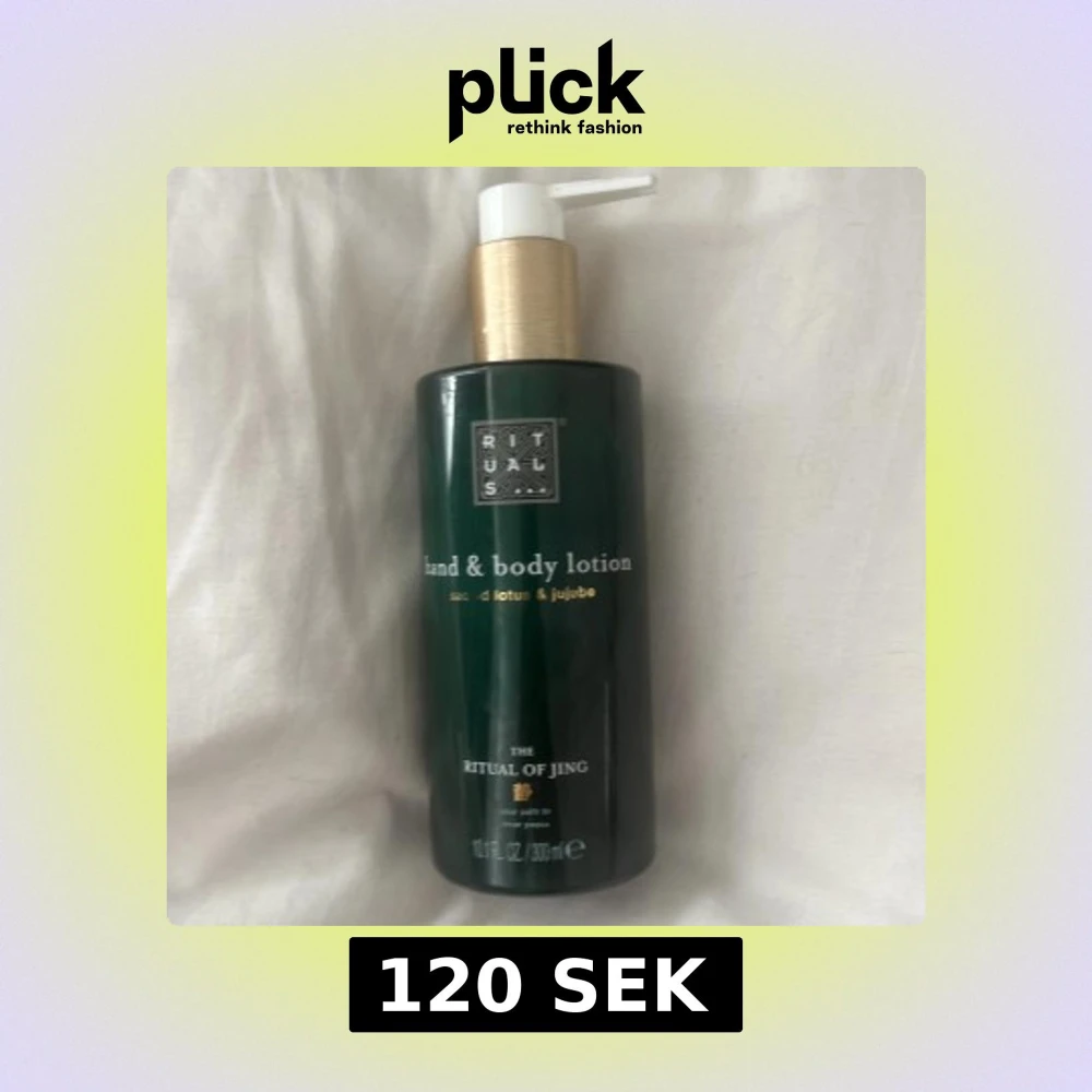 Hand- och bodylotion från Rituals i serien The Ritual of Jing. Kommer i en mörkgrön plastflaska med guldfärgad pump. Doft av lotus och jujube. Innehåller 300 ml och ger huden en mjuk och återfuktad känsla. Aldrig använd och perfekt som en present