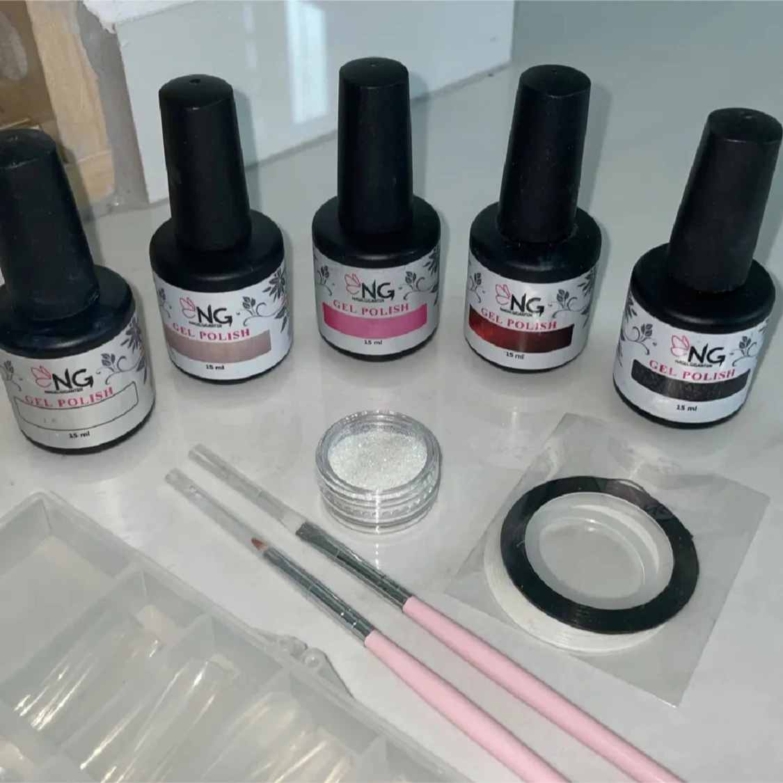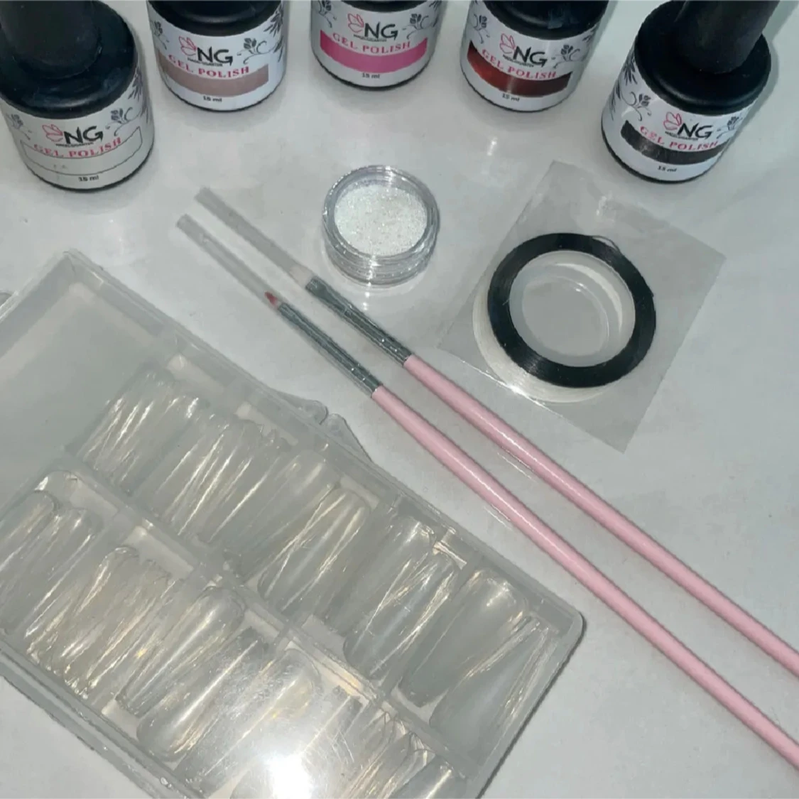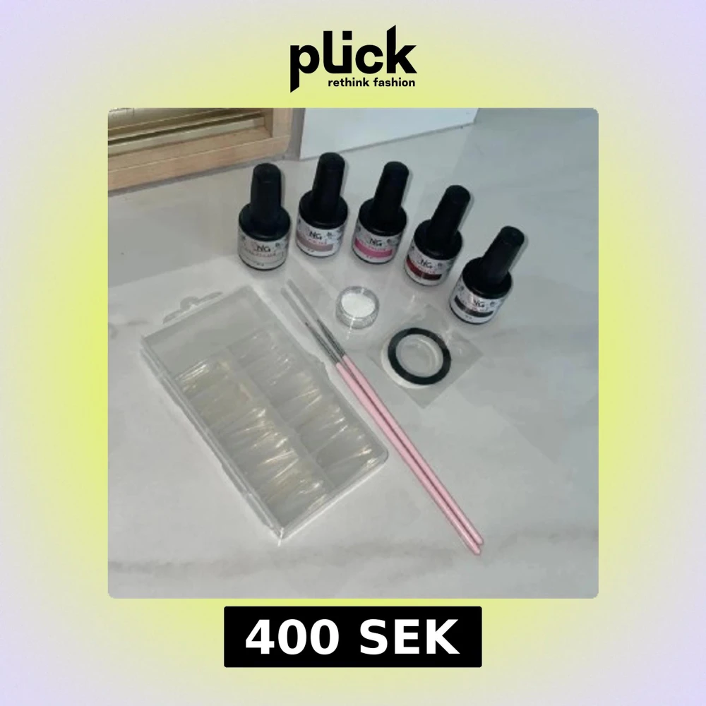Nagelkit med fem gel polish från NagelGiganten i olika nyanser: -svart, röd, rosa, lila, vit -två penslar för nageldesign -ett glitter -vit & Svart striping tejp (1mm bred) -transparenta lösnaglar i Coffin form