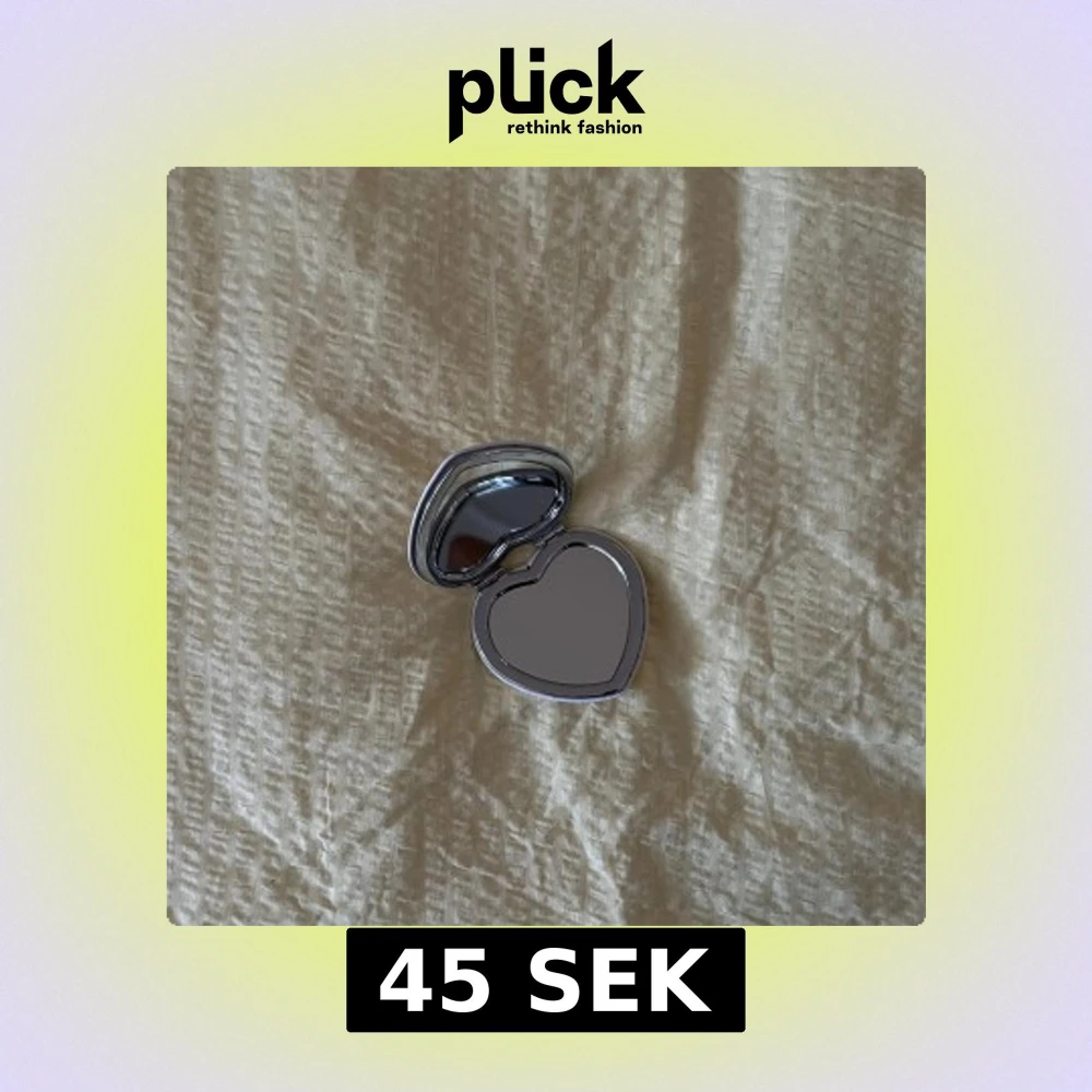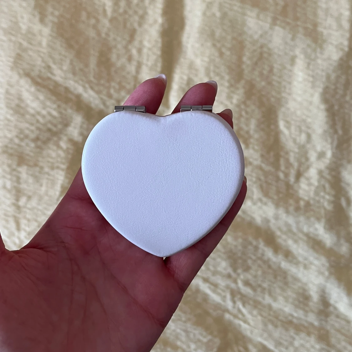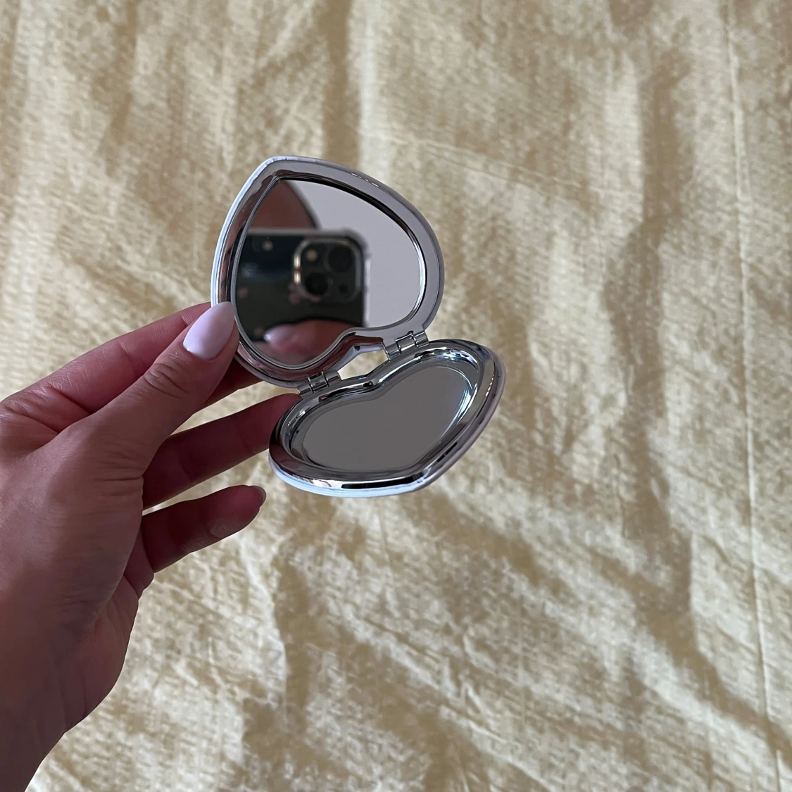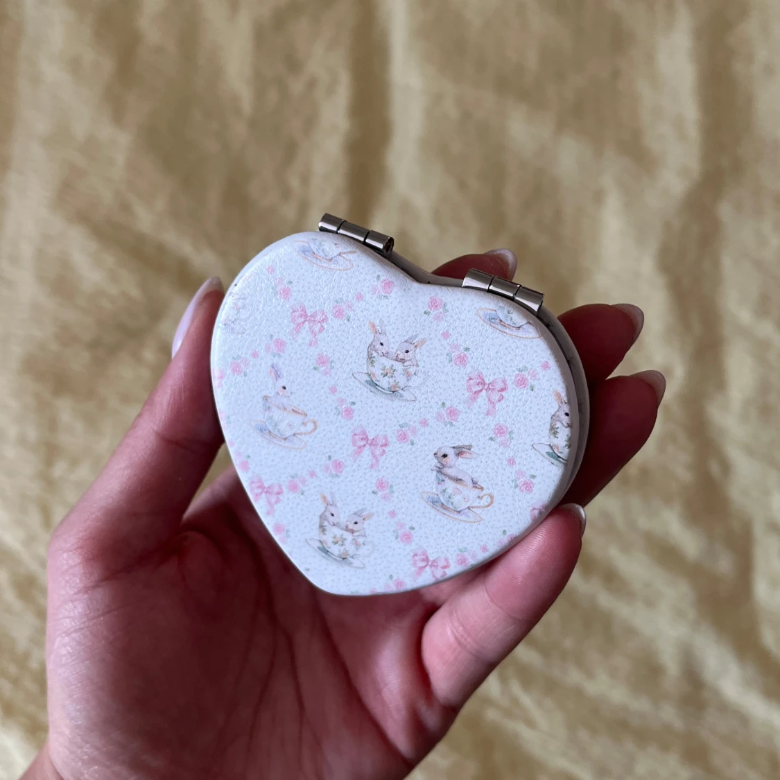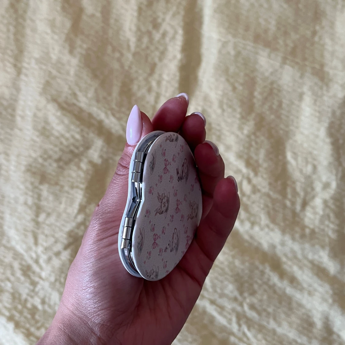 Supersöt hjärtformad sminkspegel i silverfärgad metall med vit baksida. Ena sidan har ett gulligt mönster med kaniner i tekoppar och rosa rosetter. Perfekt storlek för väskan och smidigt att ta med sig överallt.