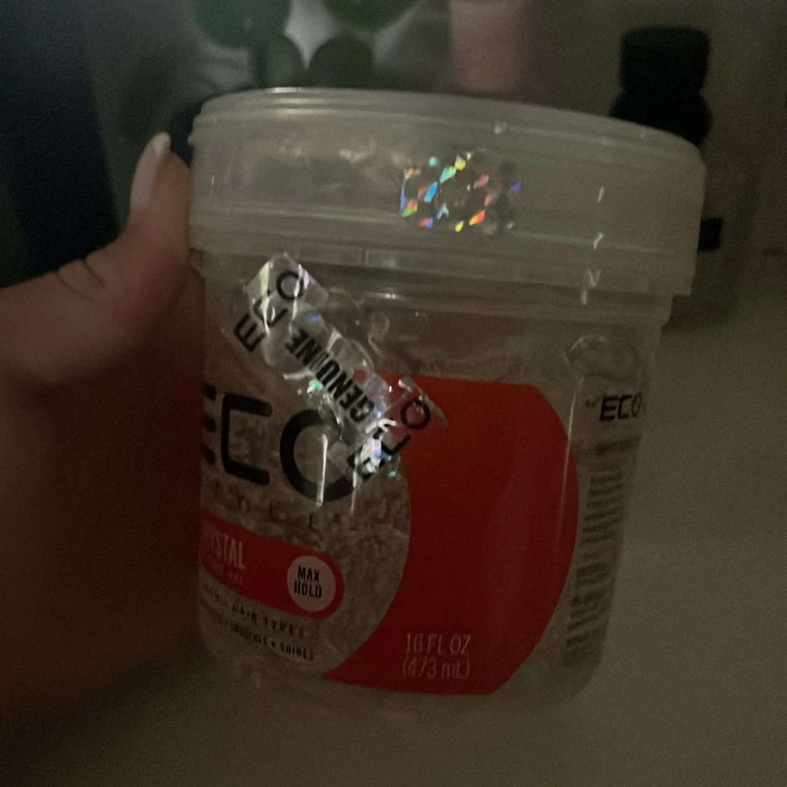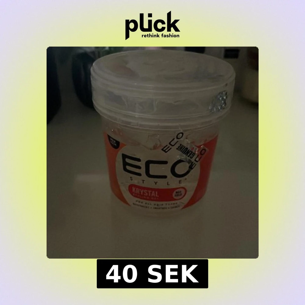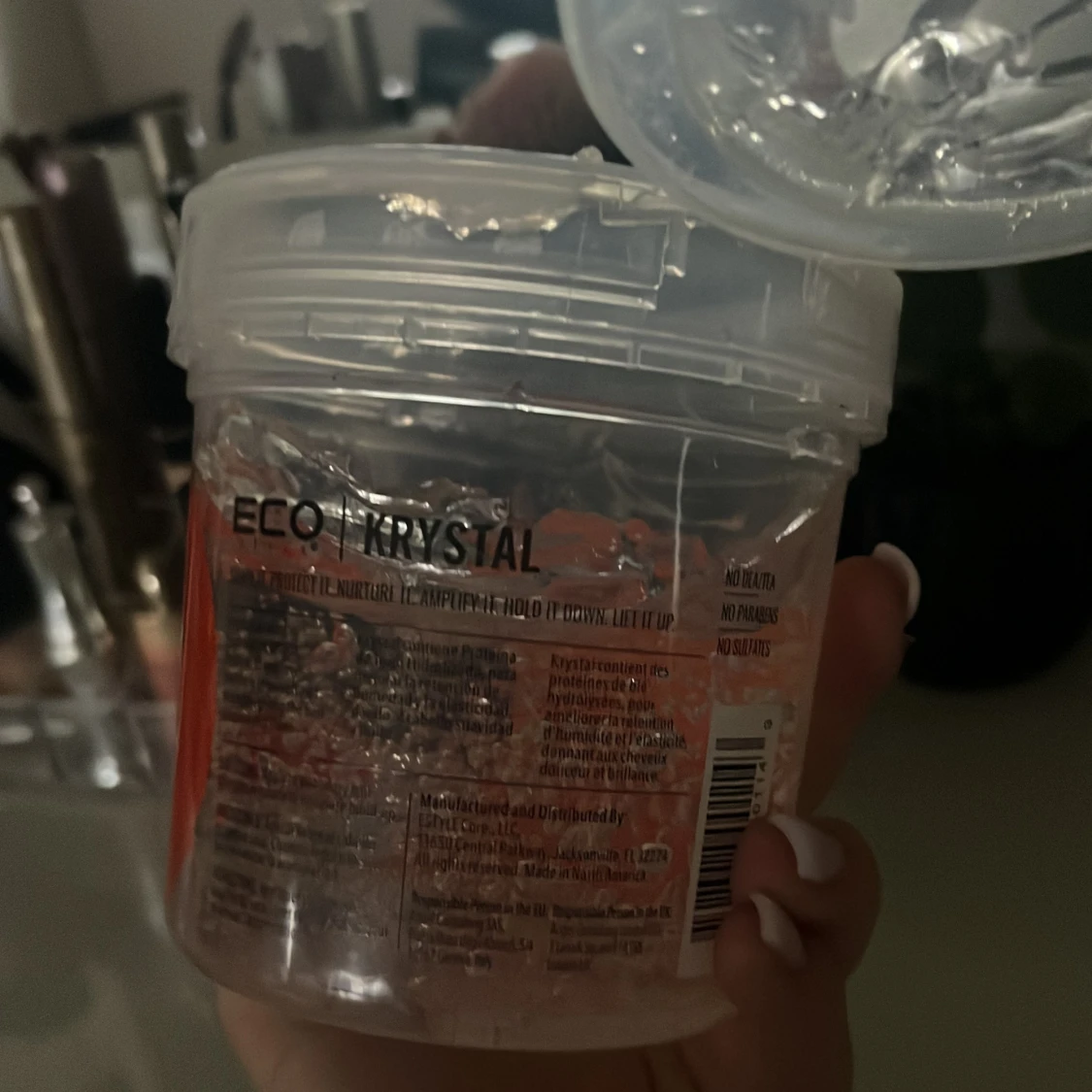 Eco Style Krystal är en genomskinlig hårgelé i en rund plastburk med vitt lock. Produkten ger maximal stadga och passar för att styla och forma håret. Innehåller aloe vera och är fri från alkohol.