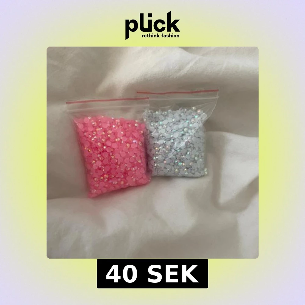 Två påsar med glittrande ansiktsstenar i rosa och silver. Perfekta för att skapa kreativa sminklooks eller festivalmakeup. Stenarna är runda och platta, lätta att applicera med lim för extra effekt på ögon eller kinder.