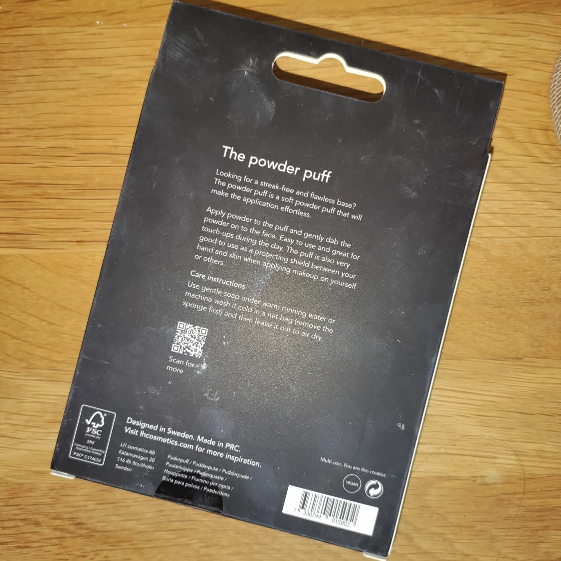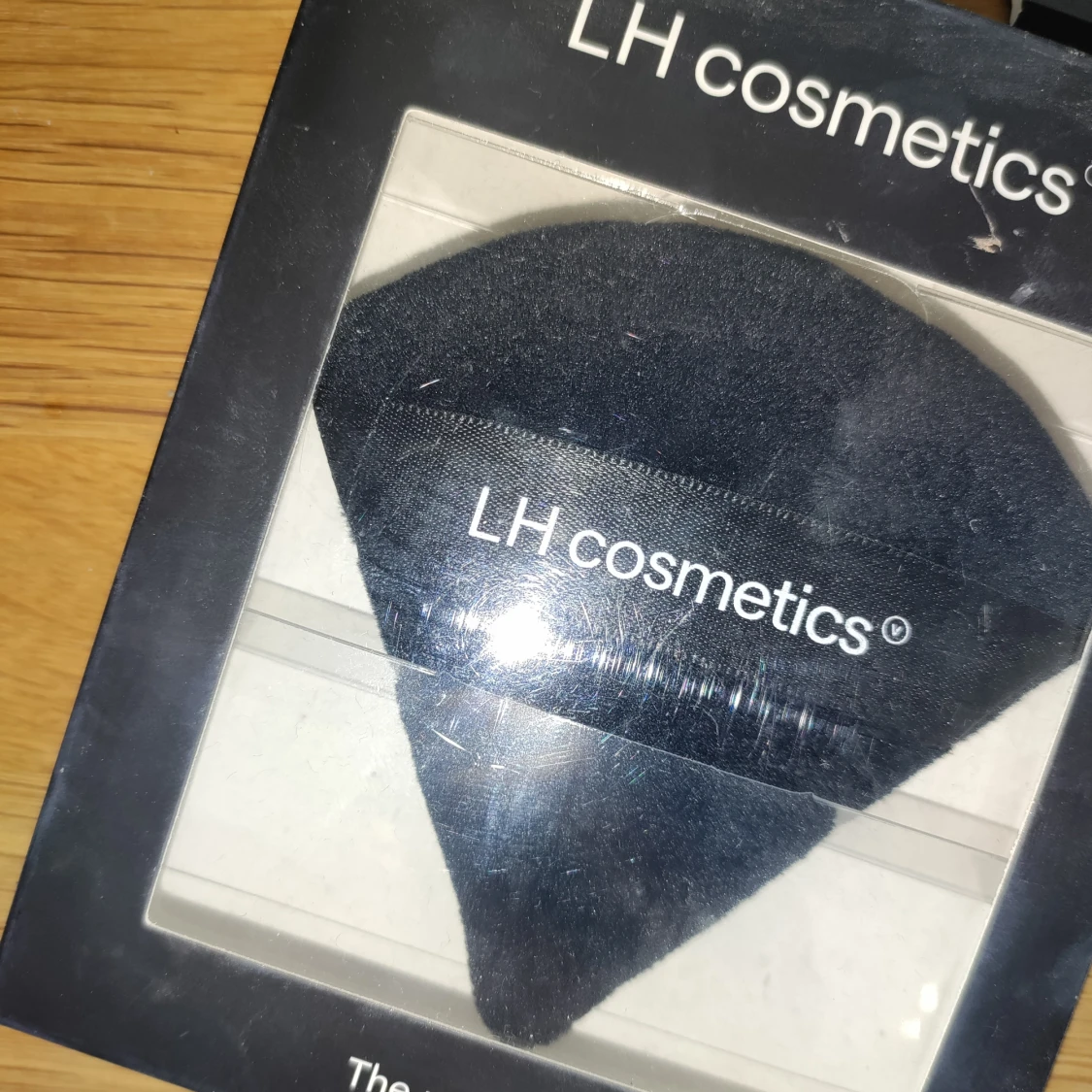 En mjuk och svart powder puff från LH cosmetics, perfekt för att applicera och bättra på puder. Puffen har en trekantig form med ett band för grepp där LH cosmetics-loggan syns. Materialet är lent och designen gör det enkelt att nå alla ansiktskonturer. Aldrig använd