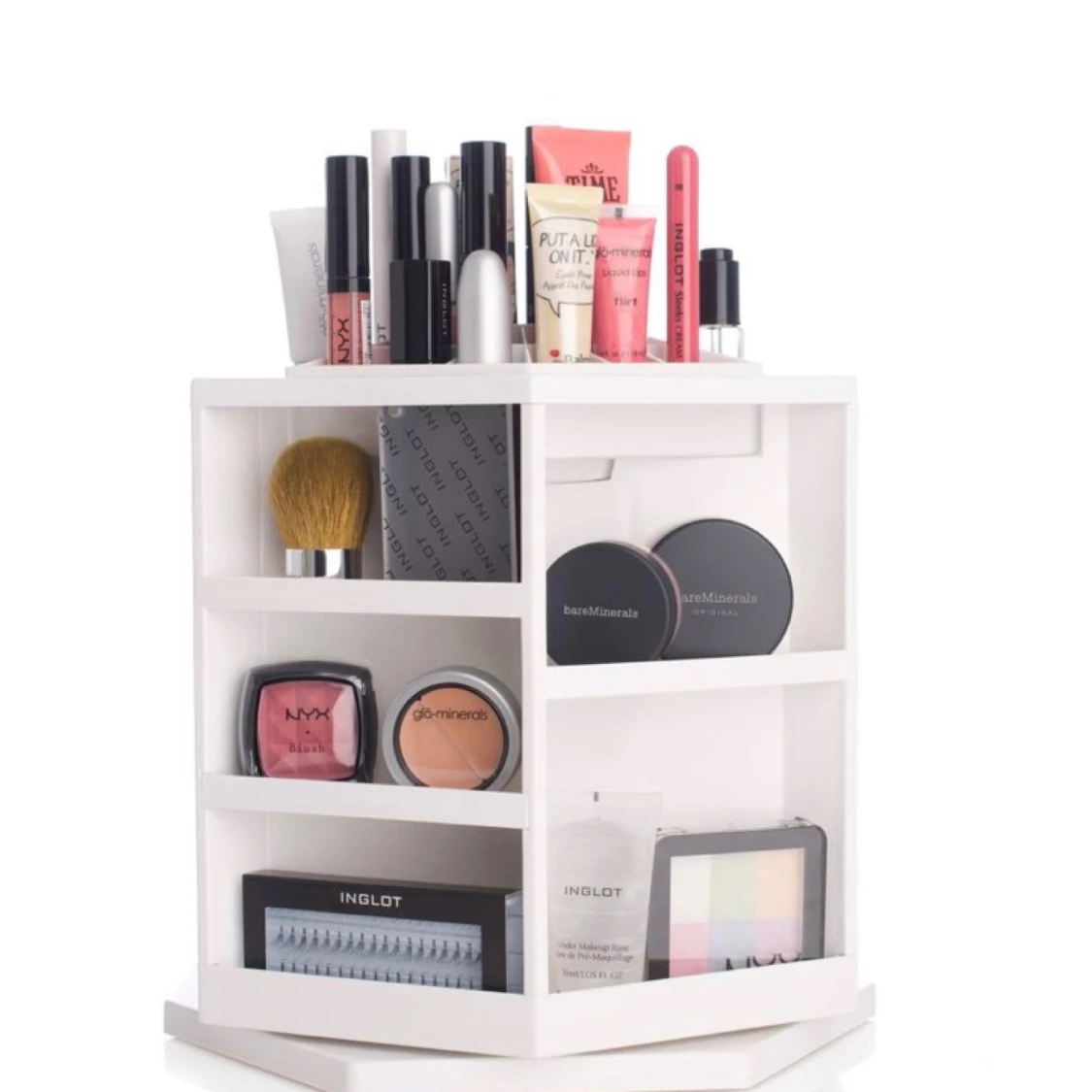 En sminkhylla som roterar i 360 grader och kan förvara allt ditt smink. I mitten finns ett större utrymme för förvaring av större produkter. Lätt att rengöra. I fint skick! Köptes för 399:- Höjd: 25cm Bredd: 29cm Bredd på sidohyllorna: 15cm