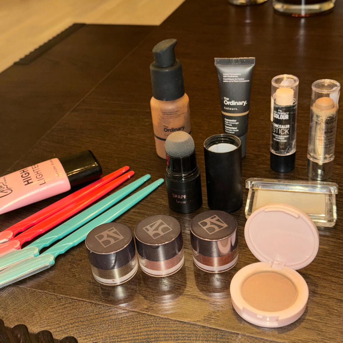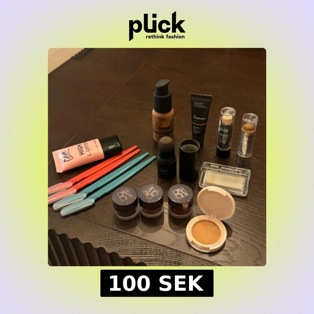 Ett komplett sminkset med foundation från The Ordinary, highlighter i rosa tub, concealer sticks, och flera ögonskuggor i burkar. Inkluderar även en kompakt puder och sminkborstar i olika färger.