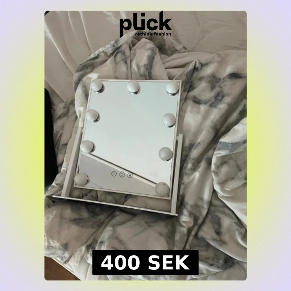Säljer en vit sminkspegel med åtta runda LED-lampor runt spegeln och touch-knappar för att justera ljuset. Spegeln har en stabil metallram och medföljer strömadapter och kabel. Perfekt för att få till flawless makeup och bra ljus när du sminkar dig. Kostar igenligen 700kr men fick en ny spegel nån vecka efter jag köpte denna vill bara bli av med den🤍😊