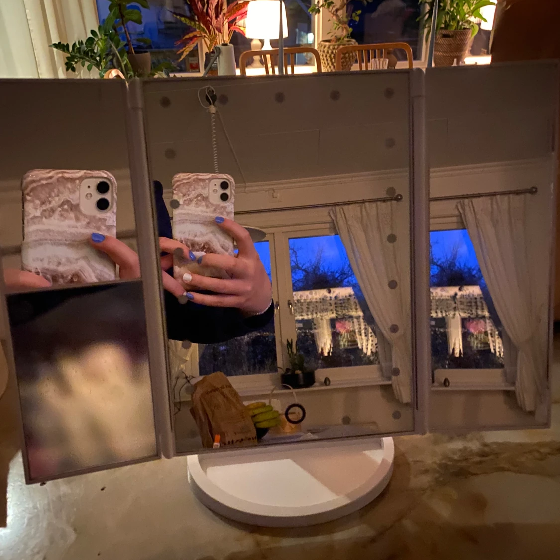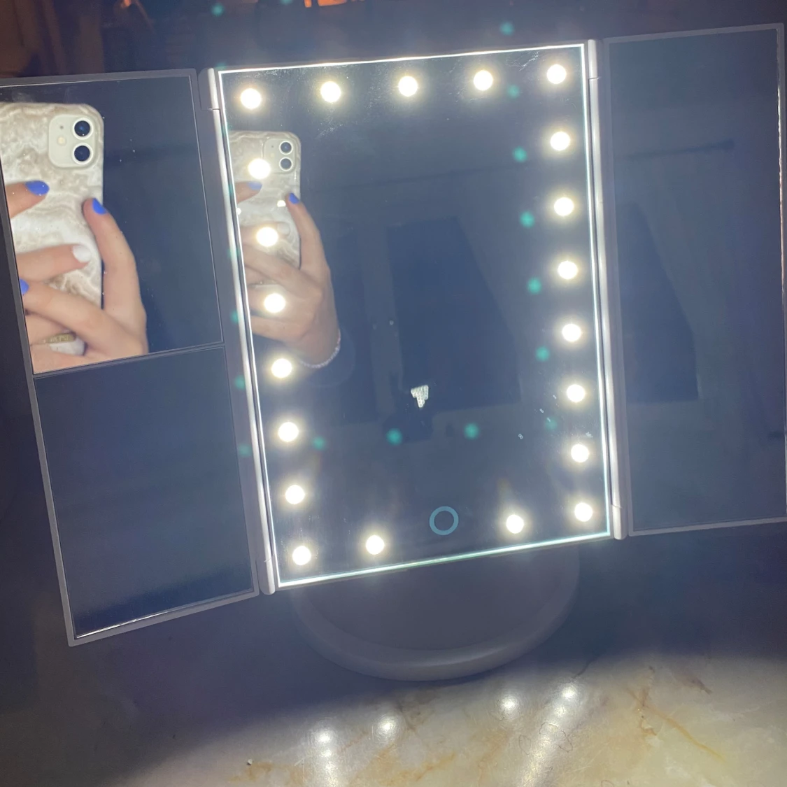 En smink spegel med 21 Leds. 34,5 cm i utvecklad form, 24 cm hög. (Ingår inte batterier)