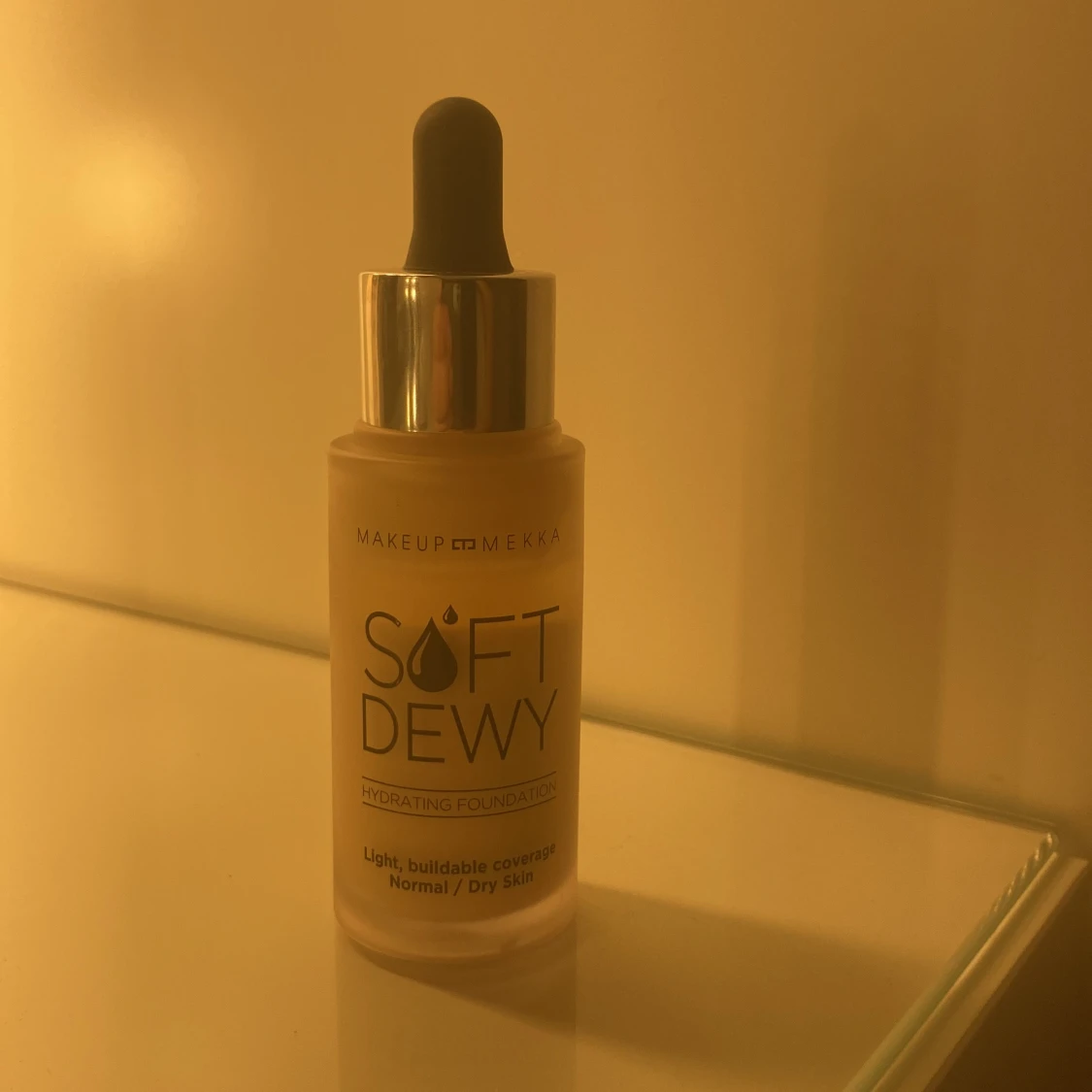 Hydrerande foundation från Makeup Mekka i nyansen White Mocha. Kommer i en frostad glasflaska med pipett för enkel applicering. Ger lätt, byggbar täckning och passar normal till torr hud. Perfekt för en fräsch och daggig finish.