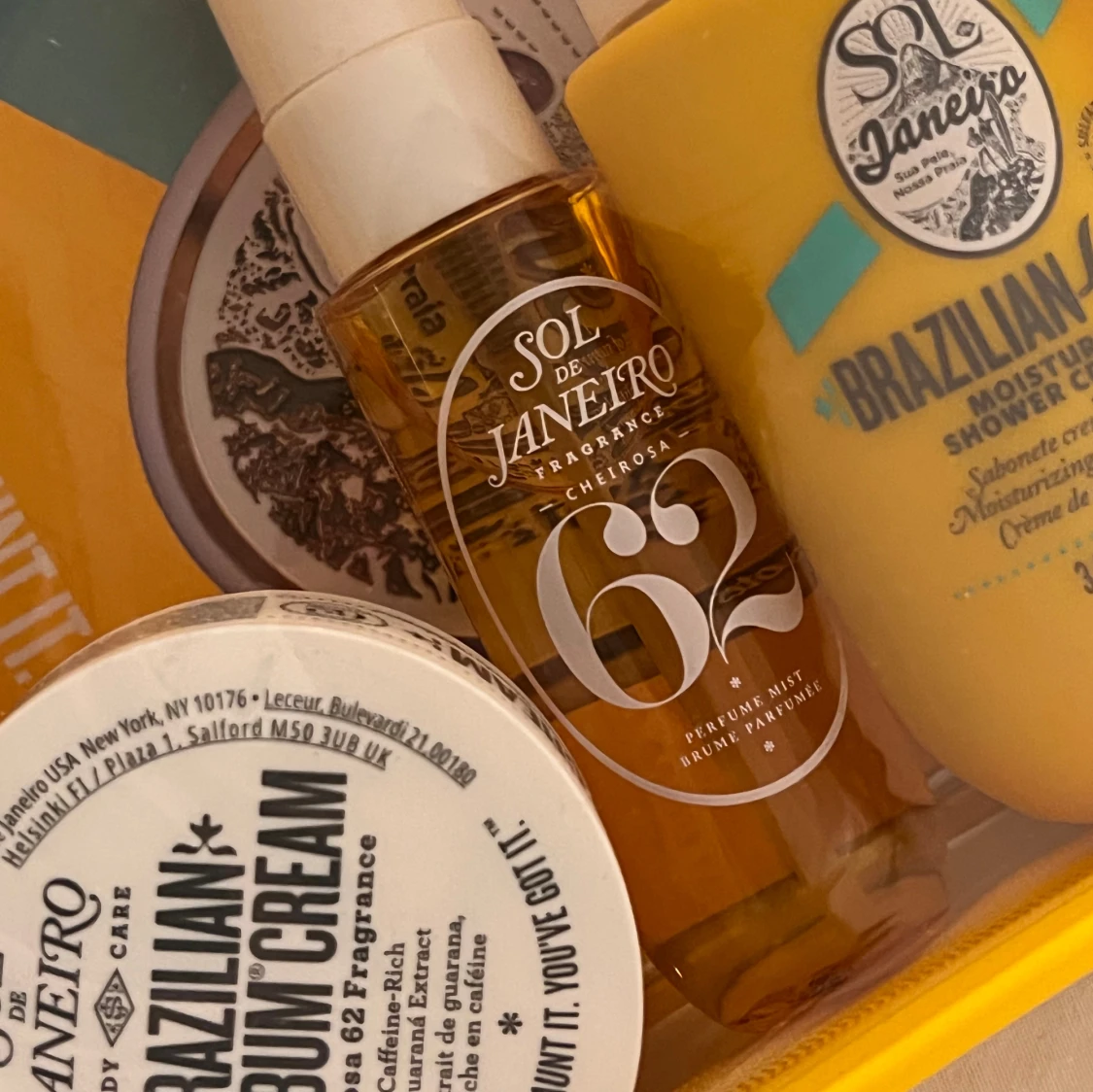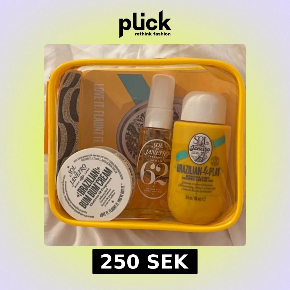 Kit från Sol de Janeiro med Brazilian Bum Bum Cream, Brazilian 4 Play Shower Cream-Gel och Cheirosa 62 Perfume Mist. Kommer i en snygg gul necessär. Produkterna har tropisk doft och krämig konsistens, perfekt för dig som älskar lyxig hudvård och fräscha vibes. Oanvänt!