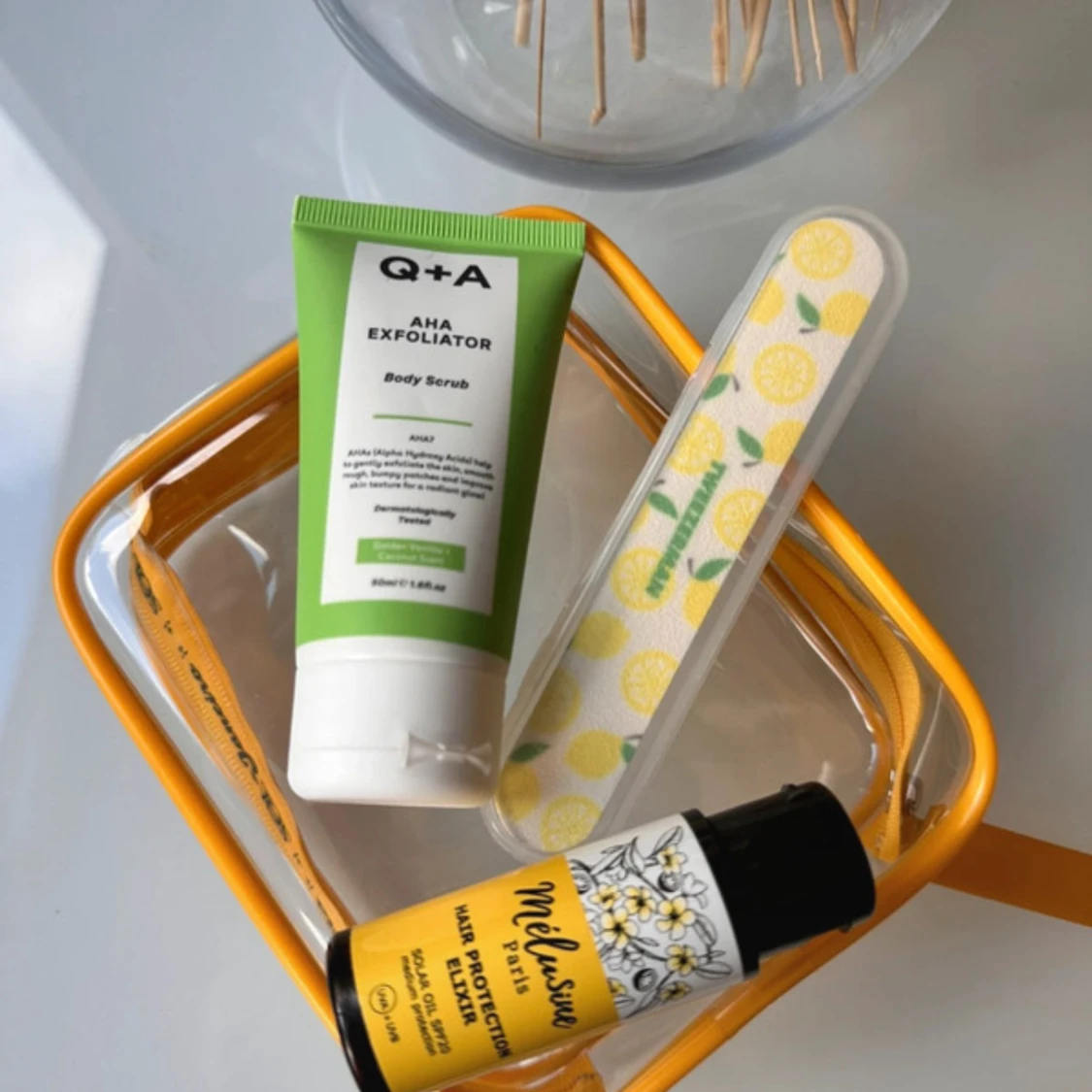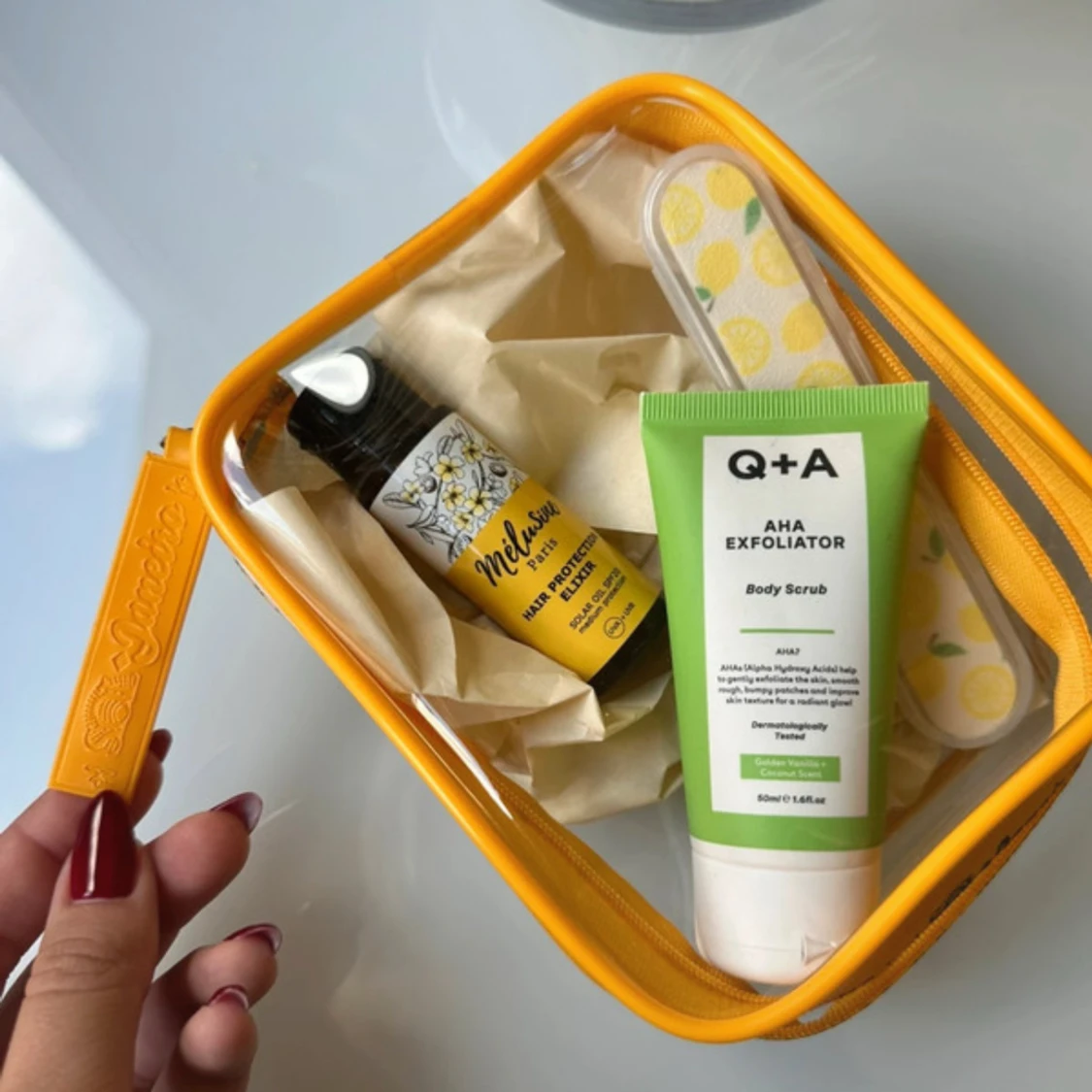 Nytt skönhetskit med hårolja, kroppsskrubb och nagelfil. Kommer i en sol de janerio neccisär🧡