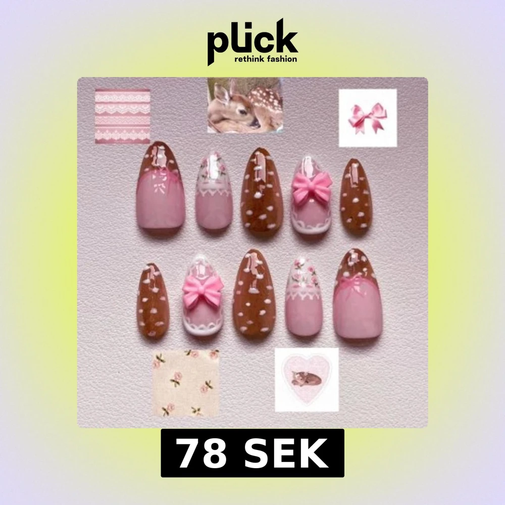 Supergulliga nageltips i rosa och brunt med vita prickar, små blommor och 3D-rosetter. Designen har Bambi-inspirerade detaljer och spetsmönster, perfekt för dig som älskar kawaii och romantisk stil. Naglarna är i oval form och passar dig som vill ha extra cute vibes.