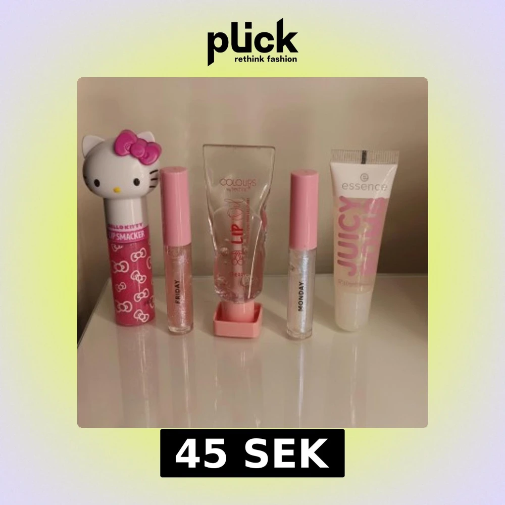 Fem läpprodukter: Hello Kitty Lip gloss med rosa design, två glittriga läppglans med rosa och silvriga toner, Technic Lip Oil Cherry och Essence Juicy Bomb Shiny Lip Gloss. Några av dom är testade.