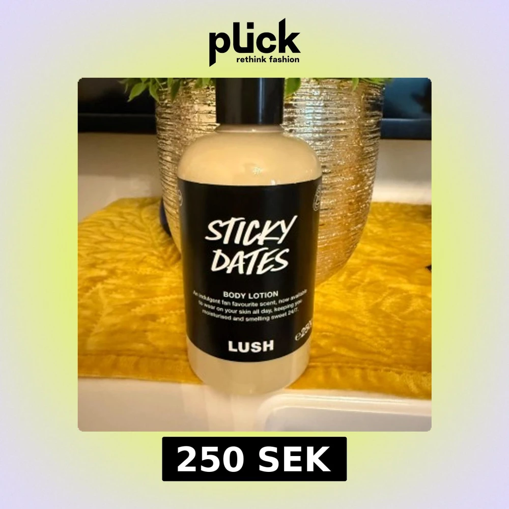 Sticky Dates Body Lotion från Lush i en beige krämig formula med söt doft. Kommer i en svart plastflaska på 250 ml med vit text. Perfekt för dig som älskar lyxiga, väldoftande hudvårdsprodukter.