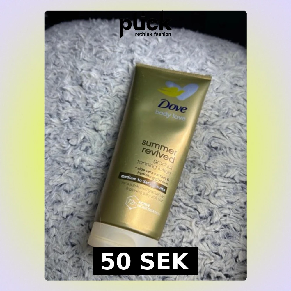 Dove Summer Revived gradual tanning lotion med aloe vera-extrakt och glycerin. Ger en solkysst ton för medium till mörk hud. Guldigt plastförpackning, 200 ml. Återfuktar huden i upp till 12 timmar och är vegansk.Advänd 1 gång.