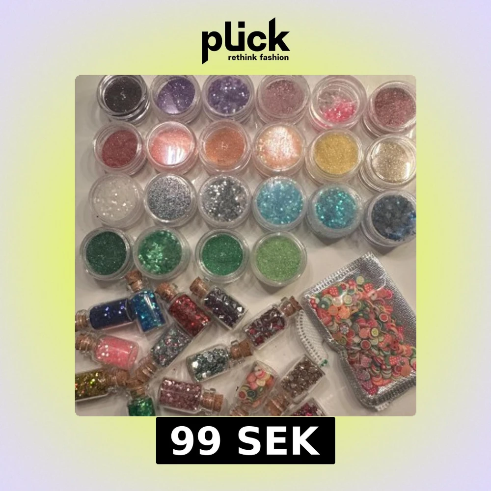 Säljer ett stort kit med lösglitter i olika färger som silver, blått, grönt, rosa och guld. Perfekt för kreativa sminkningar, naglar eller ansiktsdekorationer.( små flaskorna är tvärr sålda)