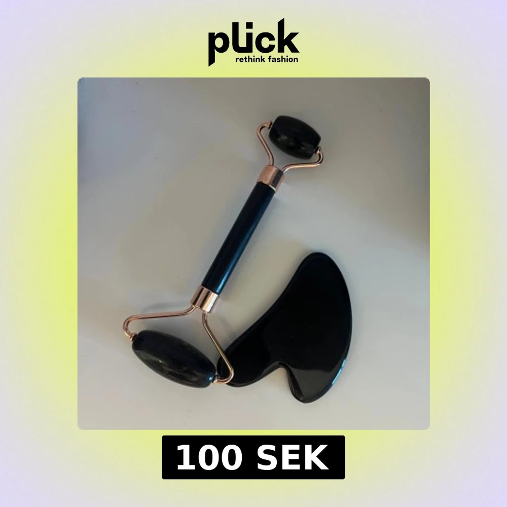 Snyggt set med svart ansiktsroller och matchande gua sha-sten i polerad sten. Rollern har detaljer i roséguld och två rullar för ansiktsmassage. Perfekt för att boosta hudvårdsrutinen och ge ansiktet extra glow.