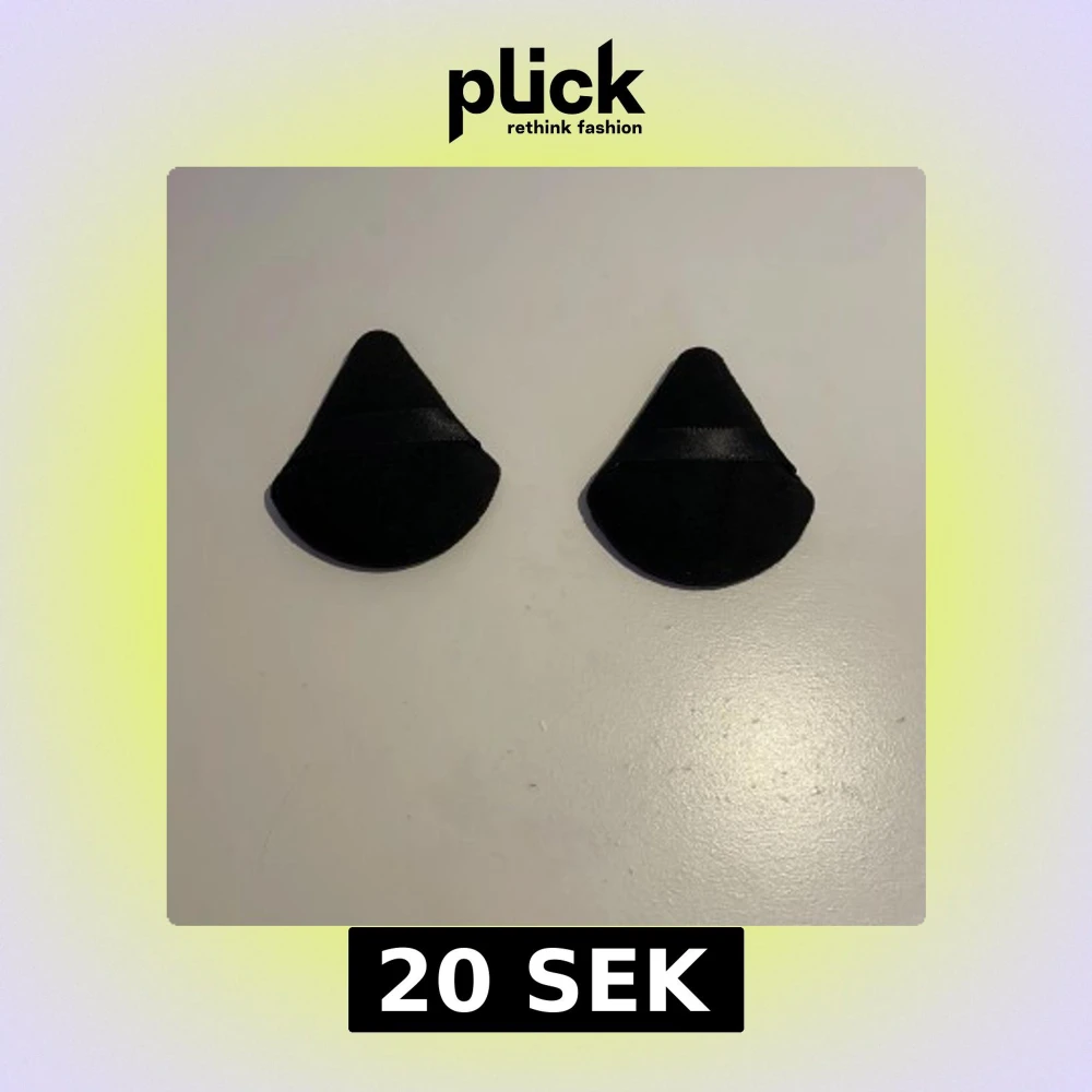 Säljer ett par svarta puderpuffar med en slät yta och en diskret glansig remsa. Perfekta för att göra ditt smink bättre. Mjuka och och små så dem får plats i din necessär.