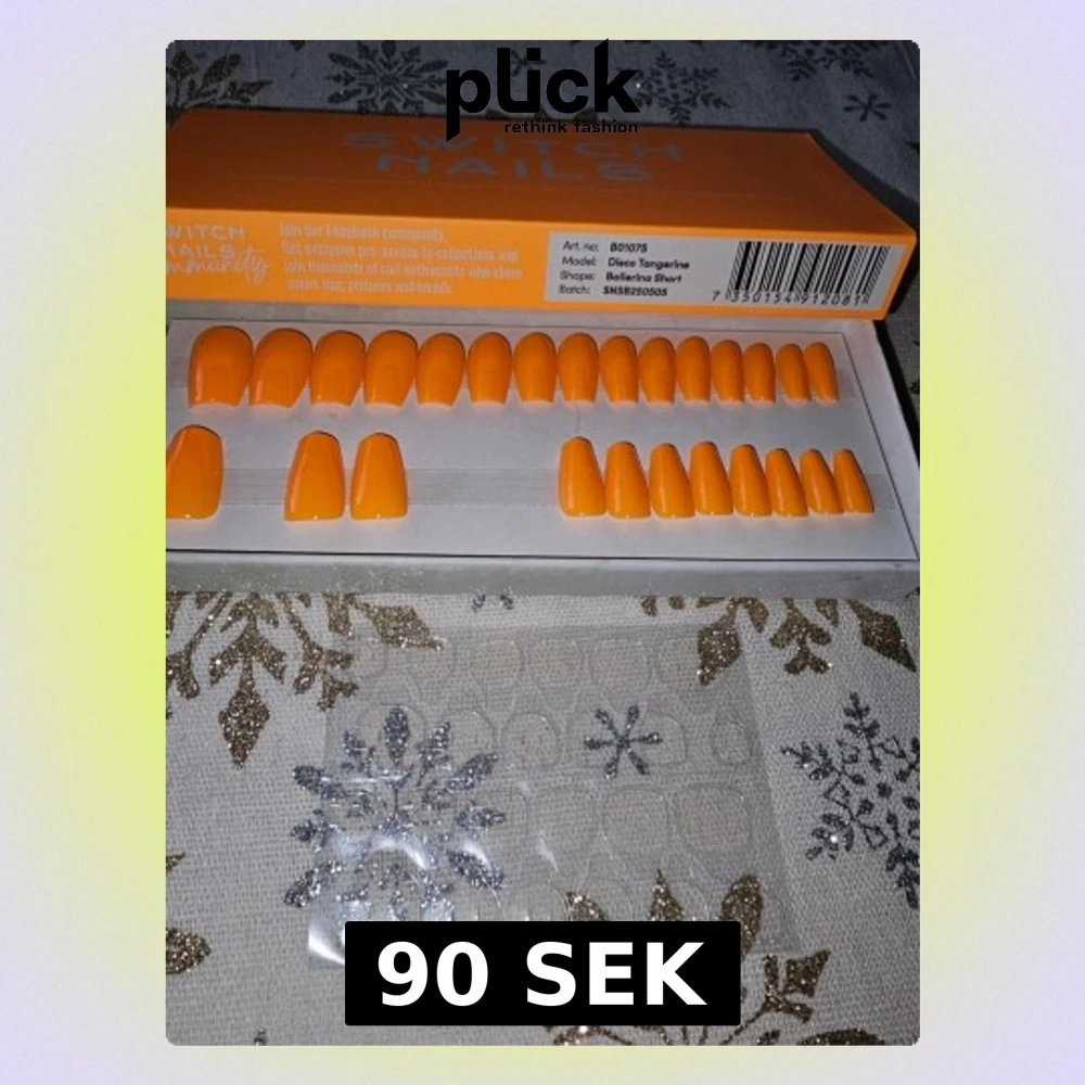 Switch Nails Disco Tangerine Ballerina Short. Alla naglar nya och oanvända. Saknas 4 stycken: 2,4,5,6. Medföljer fil, pinne, originalförpackning och gluetabs. (Gluetabs ej original).