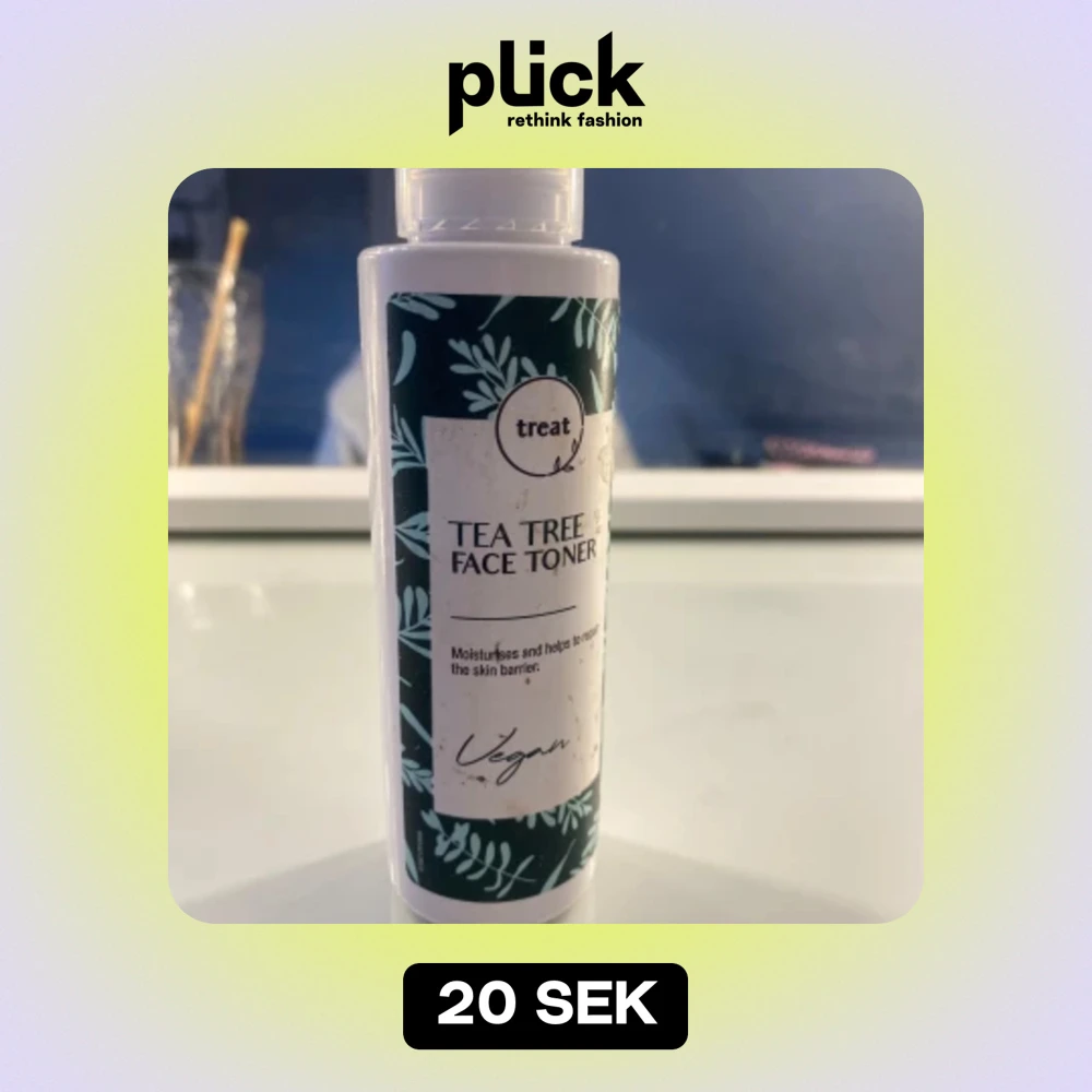 Säljer en Tea Tree Face Toner från märket Treat. Denna toner återfuktar och hjälper till att reparera hudbarriären. Den är vegansk och perfekt för daglig användning. Flaskan är vit med en grön etikett som har ett bladmotiv.