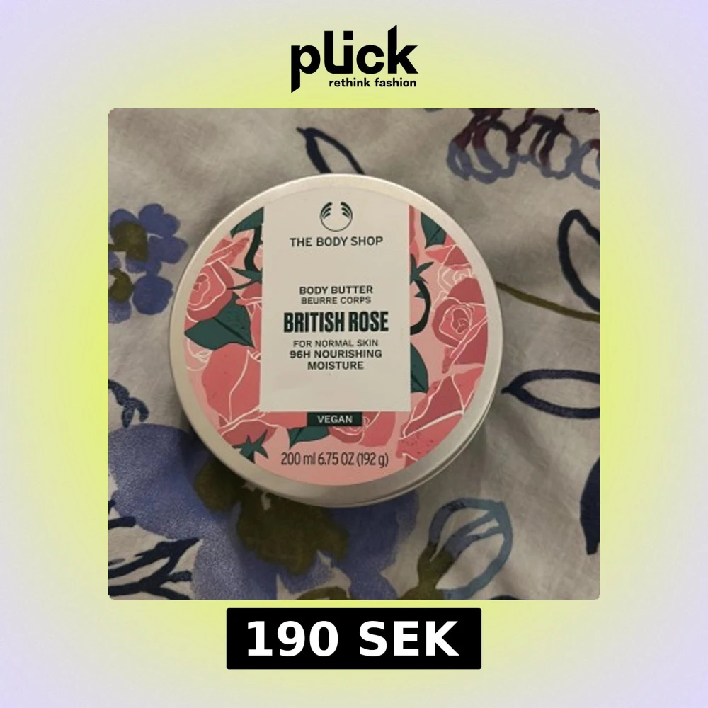 En vegansk body butter med doft av British Rose från The Body Shop. Kommer i en rund burk med rosa och grönt blommigt lock, innehåller 200 ml (192 g) krämig, vit fuktgivande formula som ger näring i upp till 96 timmar. Perfekt för normal hud och ger en fräsch rosendoft.