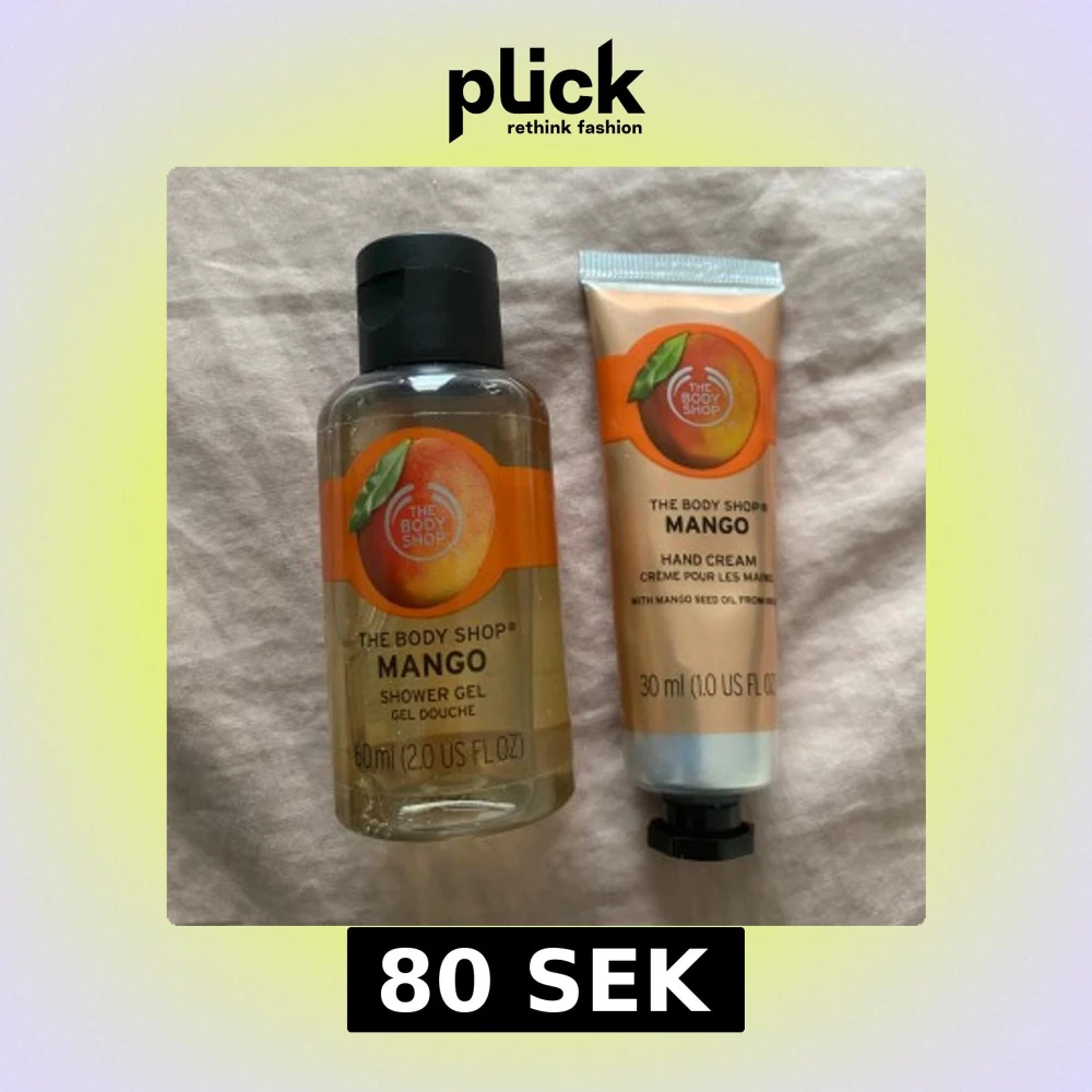 Säljer ett set med mango shower gel (60 ml) och handkräm (30 ml) från The Body Shop. Båda produkterna har en doft av mango och är perfekt att ha med i väskan.