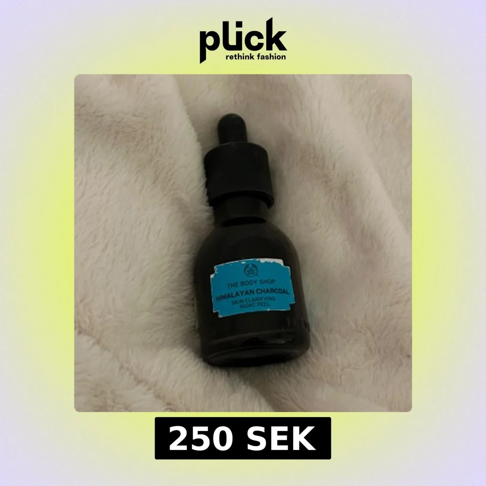 En flaska med Himalayan Charcoal Skin Clarifying Night Peel från The Body Shop. Produkten kommer i en mörk glasflaska med pipett för enkel applicering. Perfekt för att förnya och klarna huden under natten.