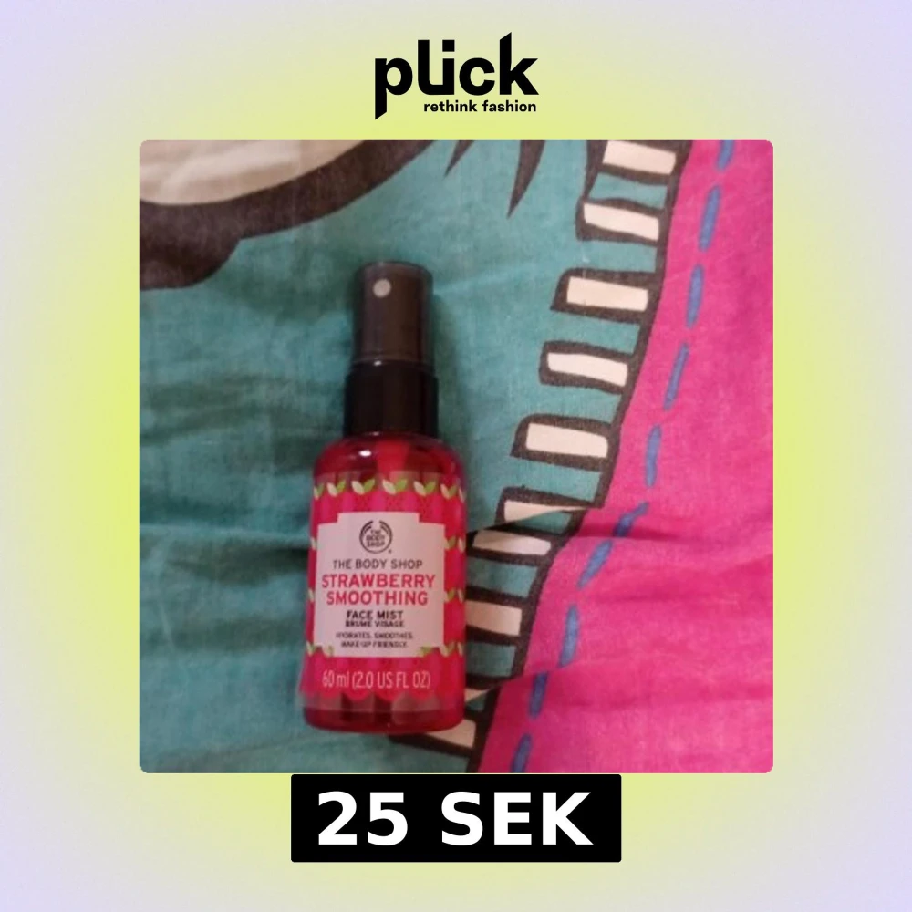 En söt röd ansiktsmist från The Body Shop med doft av jordgubb. Flaskan är på 60 ml och har en praktisk sprayfunktion. Perfekt för att återfukta och fräscha upp huden under dagen. Designen har små jordgubbar och en svart spraykork. Har använt men tycker att det svider på mig.
