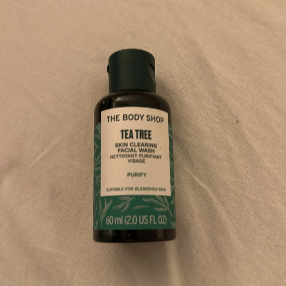 Två små flaskor från The Body Shop: en Tea Tree Skin Clearing Facial Wash (grön, 60 ml) och en Strawberry Shower Gel (orange/röd, 60 ml). Båda är i plastflaska med skruvkork, perfekt för resan eller gymväskan. Tea Tree är för ansiktet och Strawberry är en söt, fruktig duschgel.
