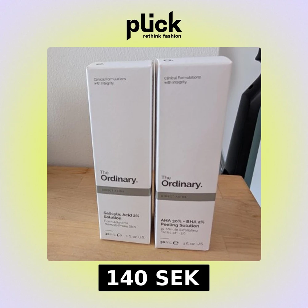 Två nya & oanvända ansiktsprodukter från The Ordinary: Salicylic Acid 2% Solution och AHA 30% + BHA 2% Peeling Solution. Perfekt för exfoliering och behandling av oren hud och porer.