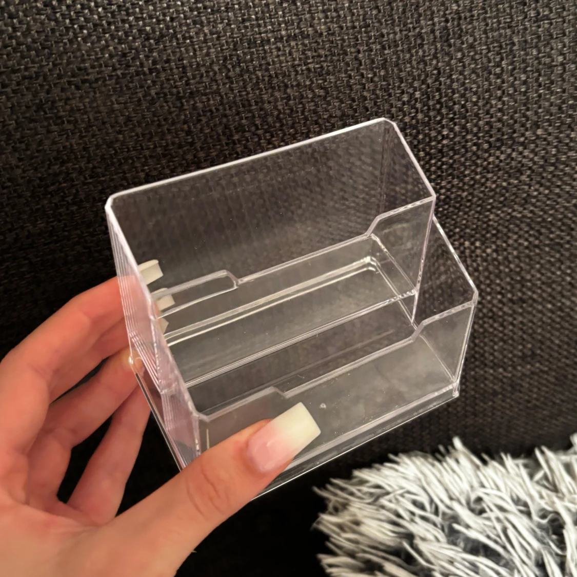 Praktisk och stilren transparent sminkförvaring i akryl. Perfekt för att organisera sminkprodukter som ögonskuggor eller läppstift. Kompakt design som passar bra på sminkbordet. Kan användas som korthållare.🌺